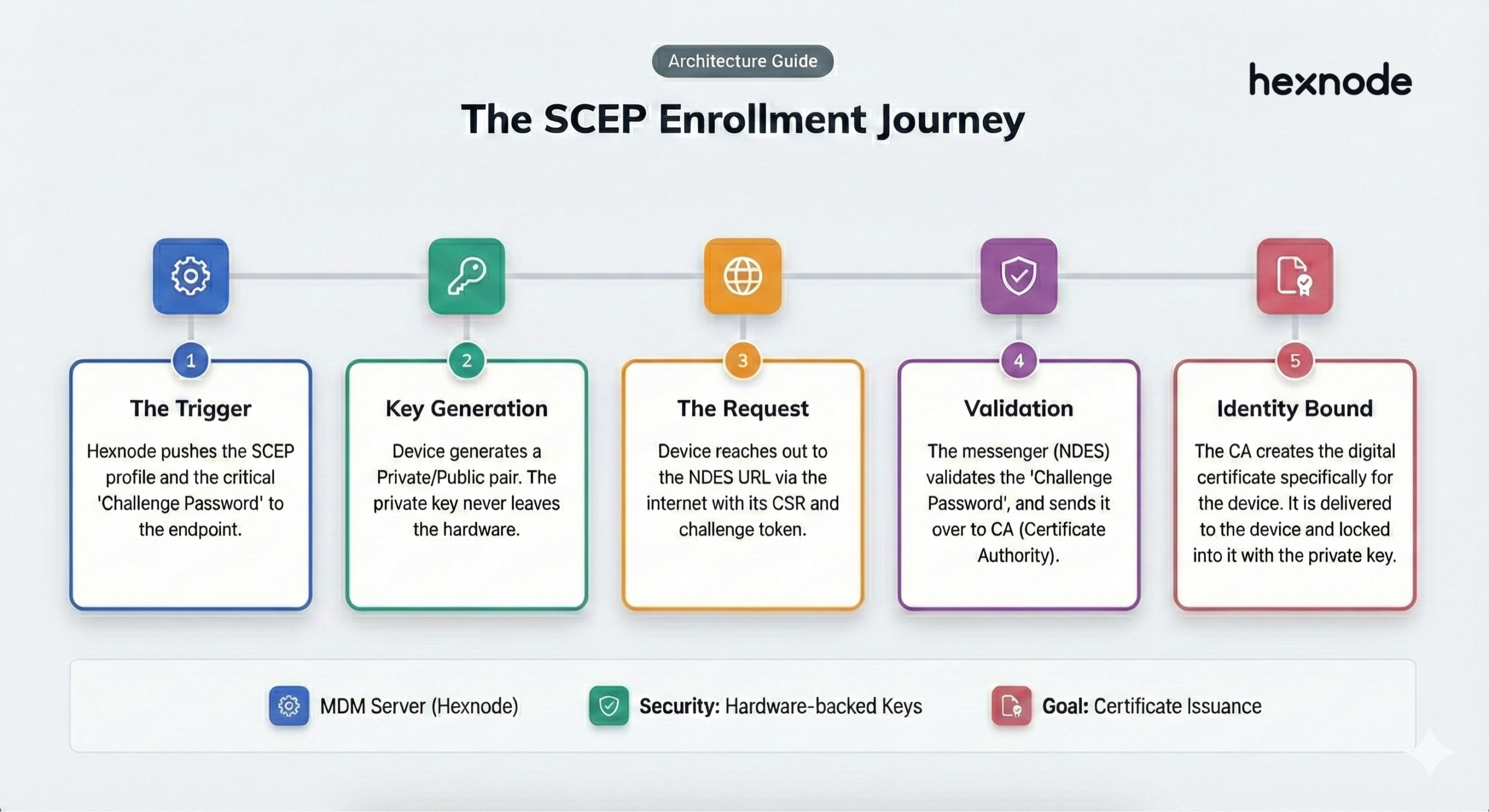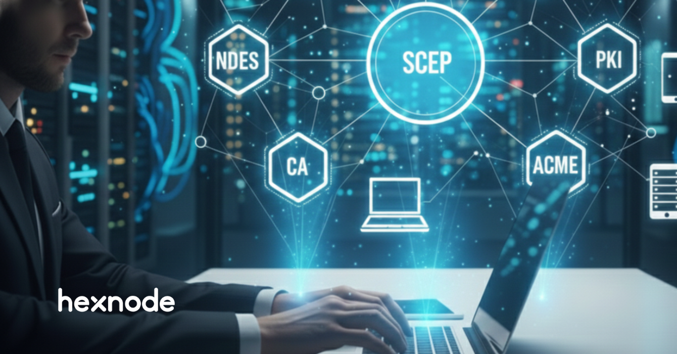 This guide decodes SCEP vs NDES, explains the architecture of automated certificate delivery via Hexnode UEM, and looks at the future of ACME (Automated Certificate Management Environment) and Device Attestation.