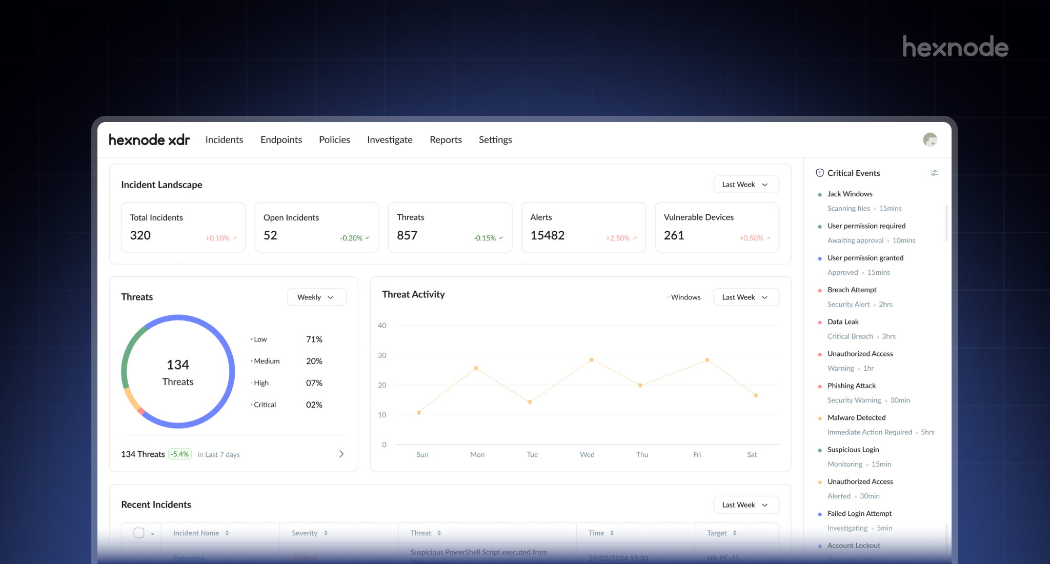 - Unified Incident Visibility: Real-time overview of threats, alerts, and vulnerable devices, helping IT admins assess their security posture quickly.