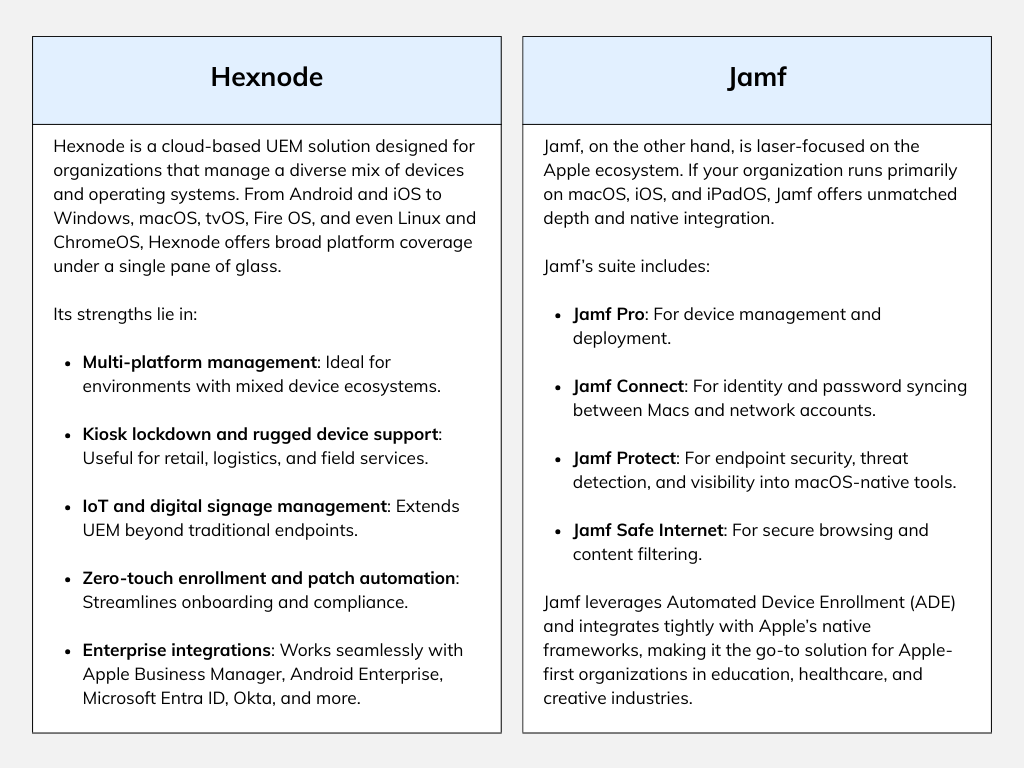 Two names often at the center of this conversation are Hexnode and Jamf.