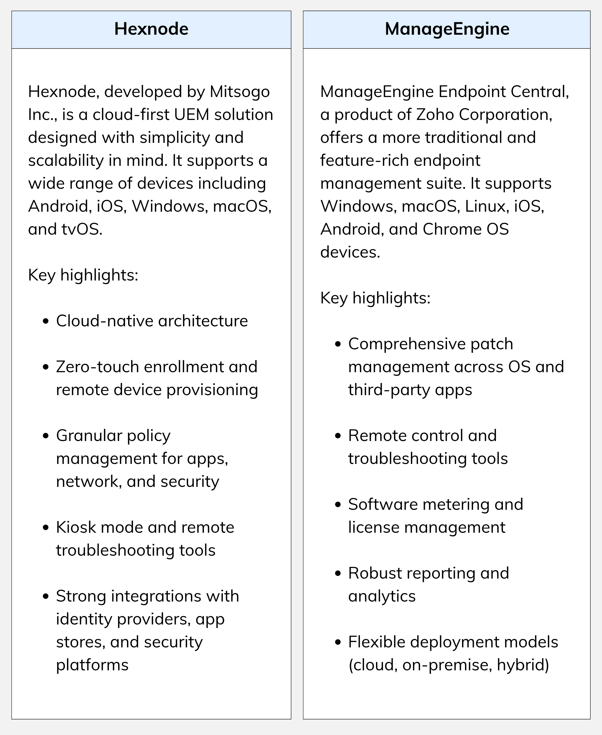 Disclaimer: This comparison is based on publicly available information as of October 2025. Features and pricing for Hexnode and ManageEngine are subject to change. We recommend visiting the official websites of both companies for the most current information. All product and company names are trademarks™ or registered® trademarks of their respective holders. Use of them does not imply any affiliation with or endorsement by them.