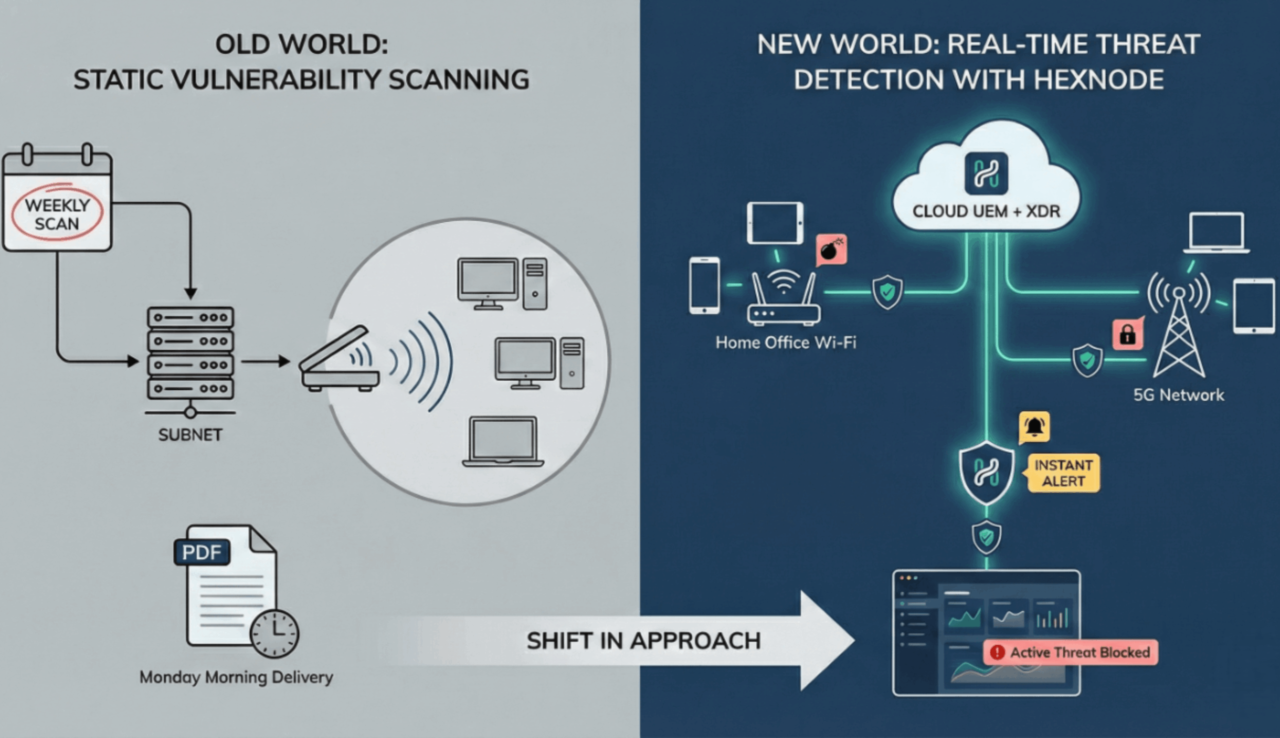 Diagram comparing static vulnerability scanning vs real-time threat detection with Hexnode.