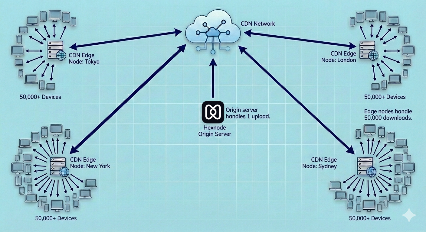 In a Scalable MDM Architecture, decoupling the control plane from the data plane is essential. If 50,000 devices tried to download 1GB from our primary AWS S3 bucket, the egress costs would be astronomical, and the throughput would collapse.