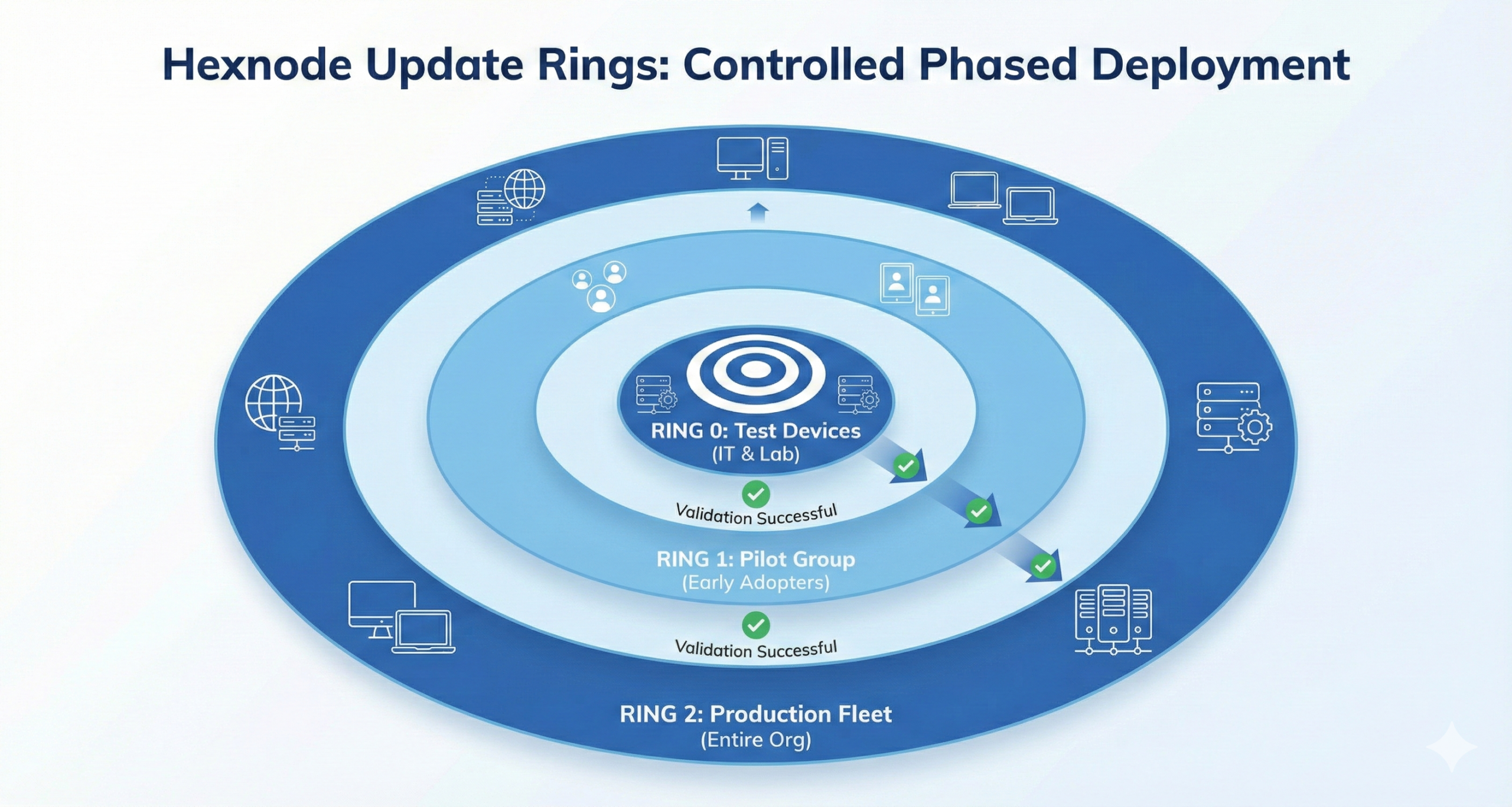 1. Controlled Rollouts with Update Rings One of the biggest barriers to faster patching is fear, the fear of breaking production systems.Hexnode addresses this through staged deployment models, commonly known as update rings. Instead of pushing patches across the entire fleet at once, devices are segmented into logical groups: