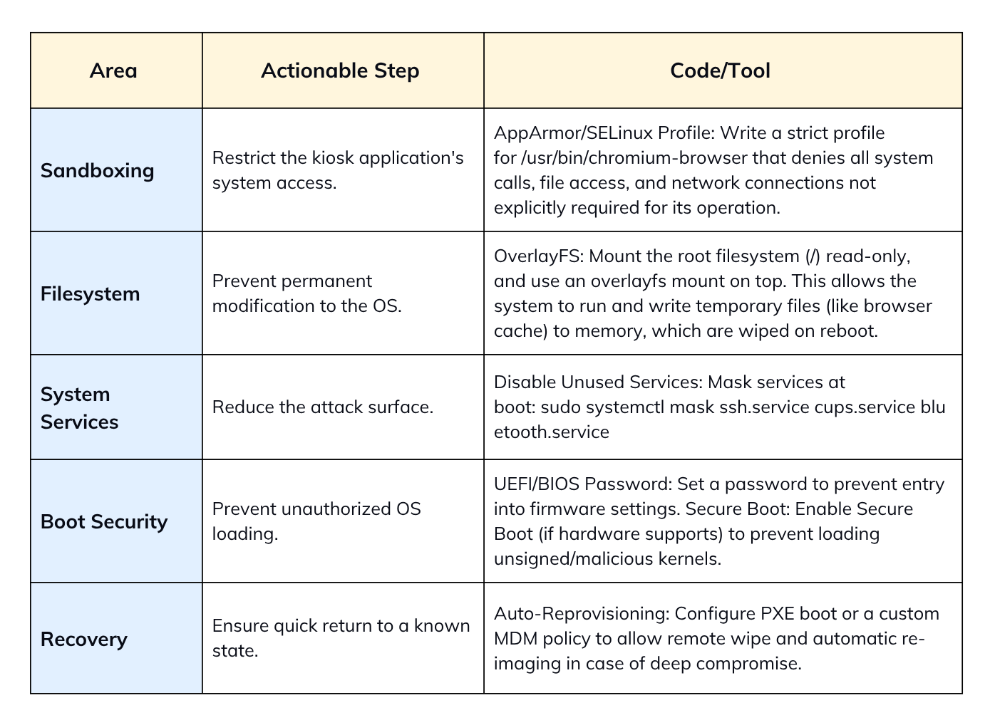 It can be hardened, but no system is fully tamper-proof. Lock shells, disable hotkeys, and block unused ports. Use SELinux/AppArmor to sandbox apps. Combine with secure boot, firmware locks, and enclosures for strong protection.