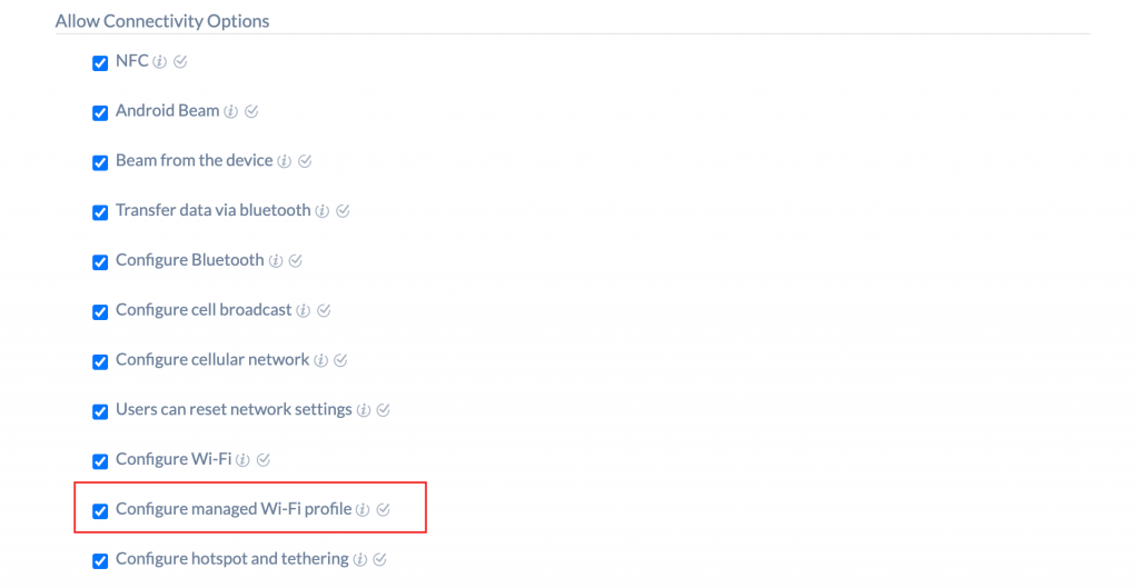 - Select the option ‘Configure managed Wi-Fi profile’ to allow users to configure the managed Wi-Fi profiles on the devices.
