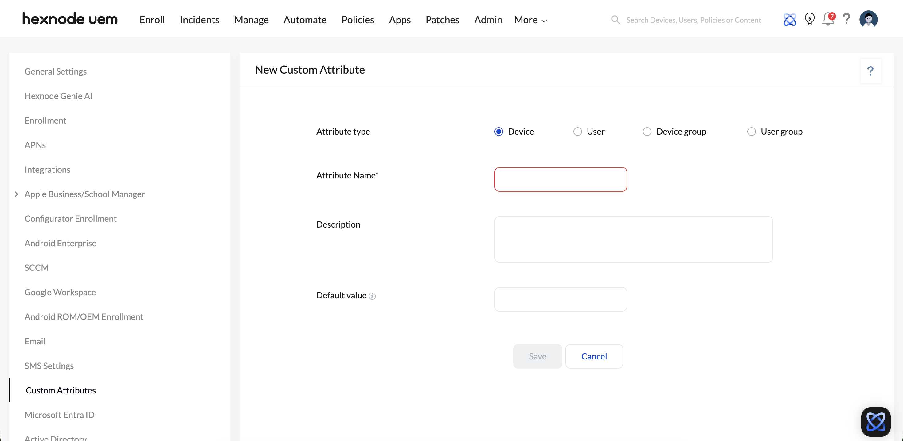 Hexnode UEM allows administrators to create up to 50 custom attributes, which can be used to store and manage additional device-, user-, or group-specific metadata.