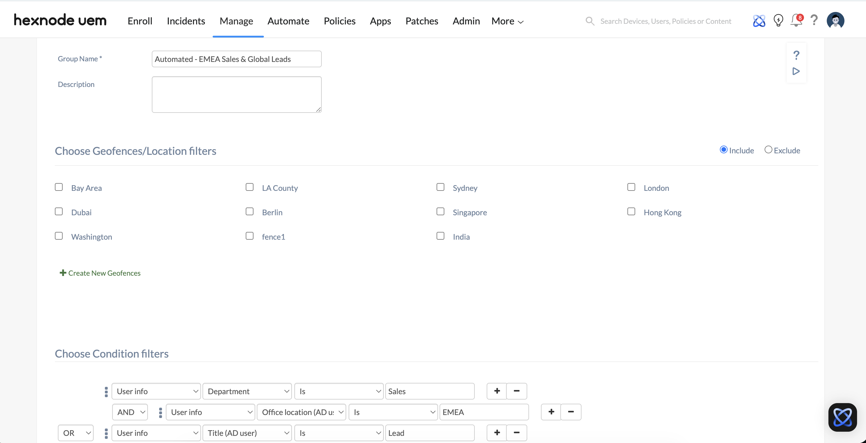 Logic Execution: Hexnode will automatically add any device that belongs to a Sales employee located in EMEA. It will also add any device assigned to an employee with the “Lead” role, regardless of their department or geographical location.