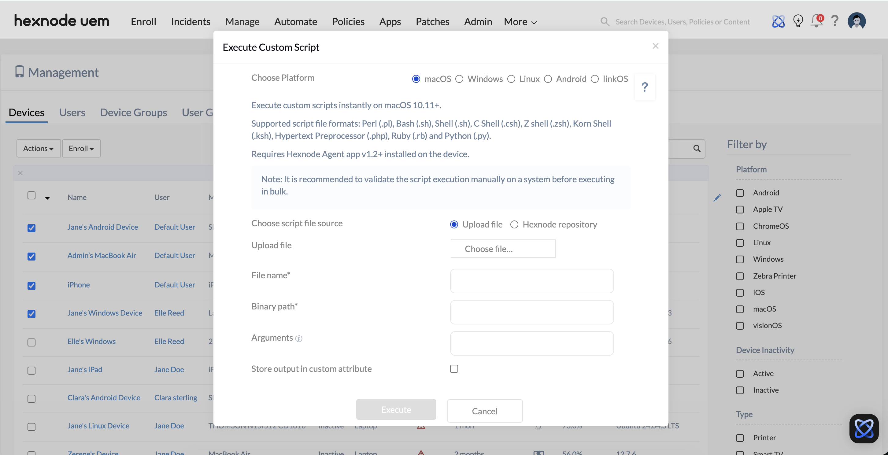 ^[A-Z]{4}to isolate the first four characters (“EMEA”). - Output: The script maps this isolated string to a Hexnode Custom Attribute (e.g., Regex_Location).