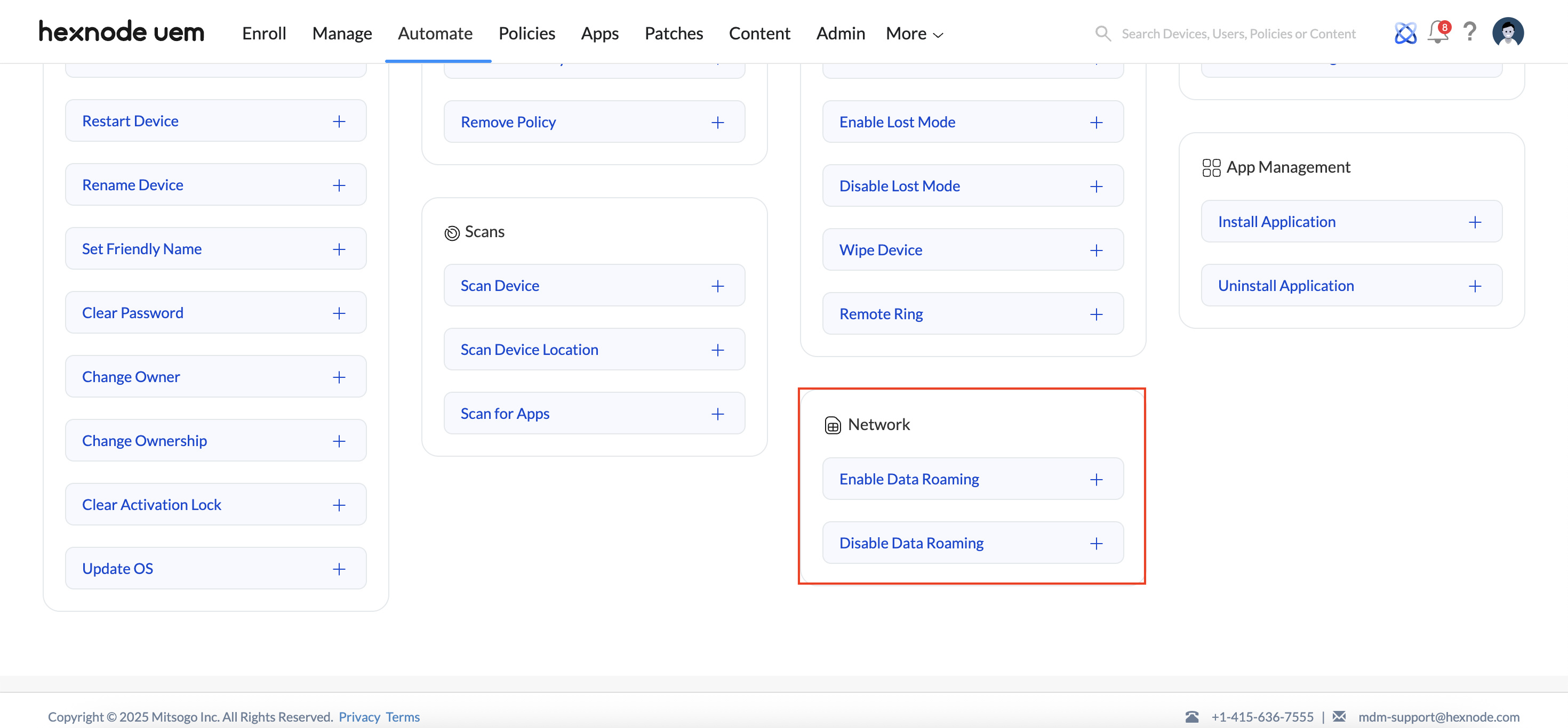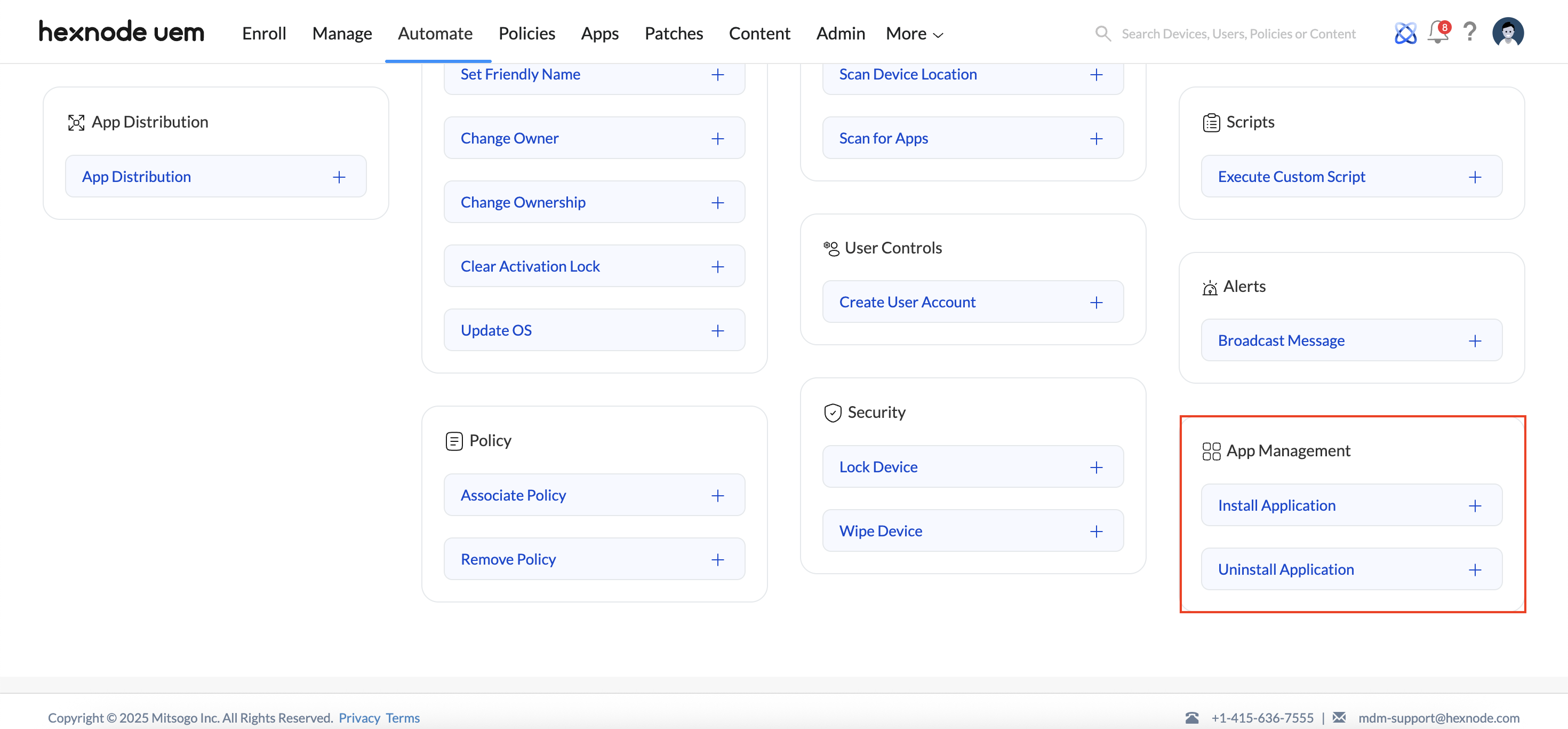 The Automate tab is designed for automating the scheduling and execution of various operations on devices, while the Policy tab enables administrators to create and manage individual policy settings that can be applied directly to devices.
