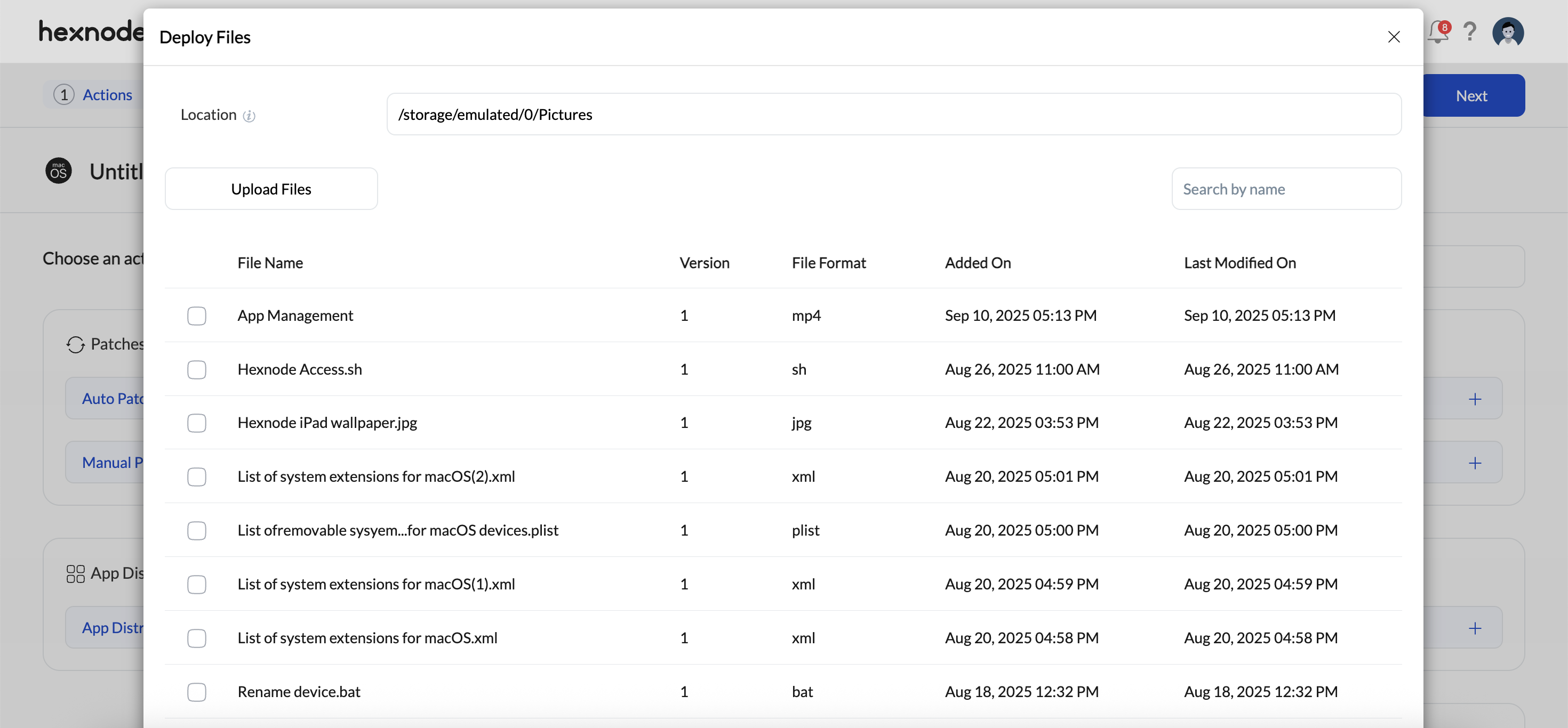 - Deploy Files – This option deploys files to a specific location on the device. You can upload the files available in the Hexnode repository.