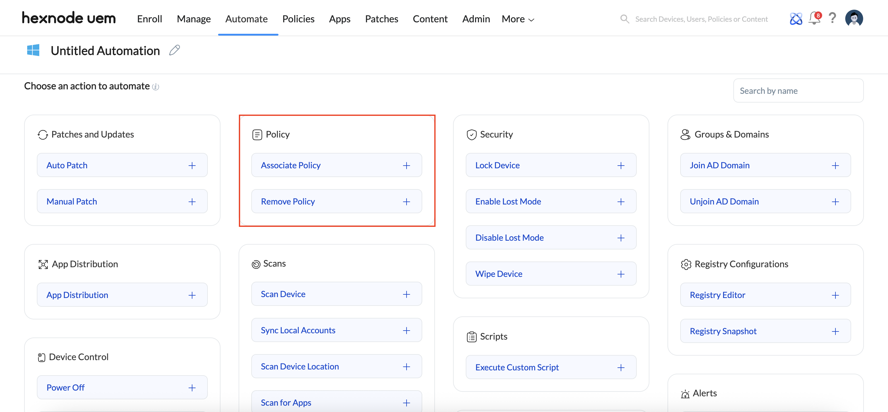 Currently, there are two options to automate under the Policy section. You can either Associate Policy (to apply a policy to the devices) or Remove Policy (to remove a policy from the devices). Only one policy can be selected at a time for either option, but additional policies can be added by selecting Add New Action.