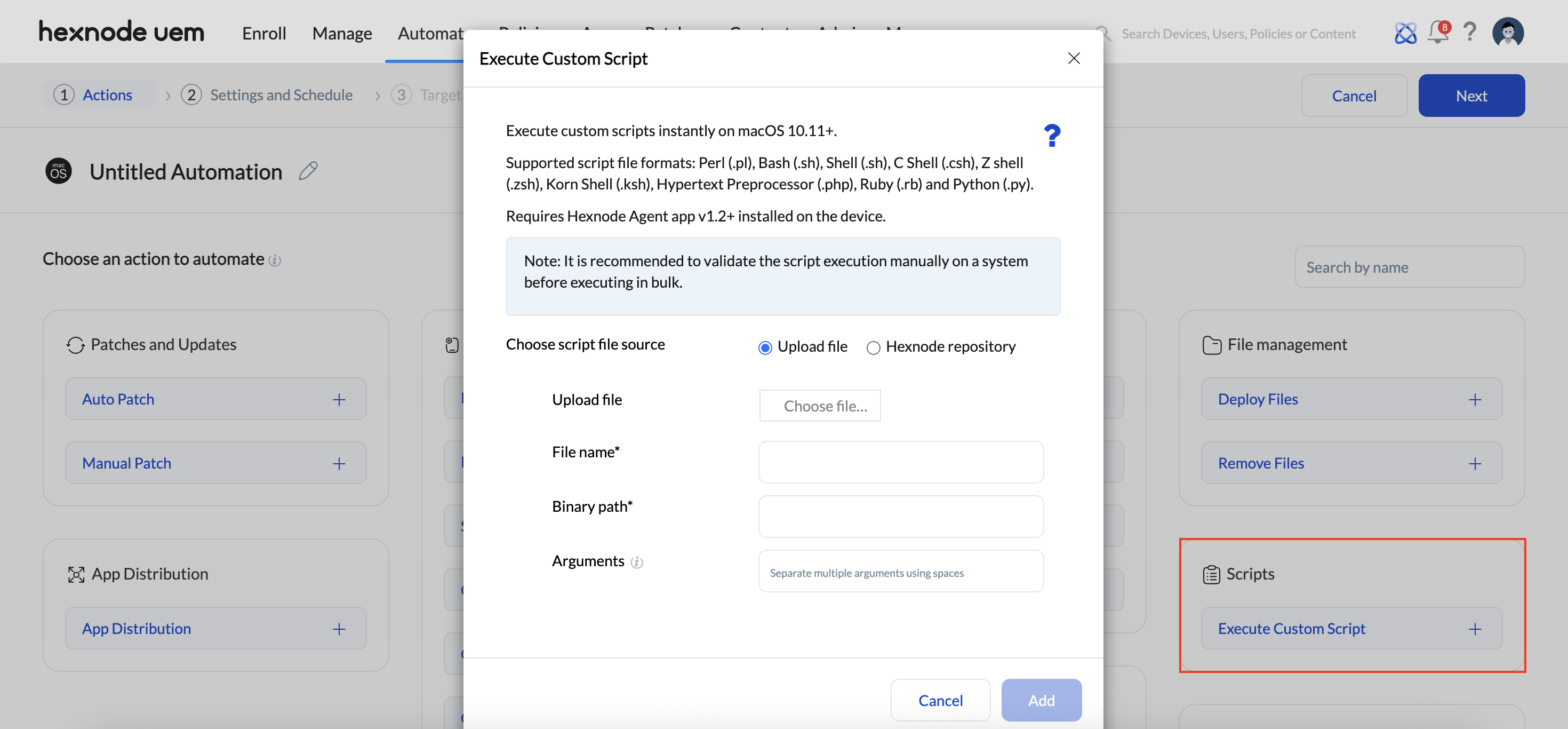The Scripts section allows you to automatically deploy custom scripts on macOS, Windows and Linux devices. To schedule a script, select the Execute Custom Script option and choose the desired script from the Hexnode content repository. If required, you can use the Arguments field to specify script inputs. This field also supports wildcards. Once you’ve configured the script, click Add to finalize the action.