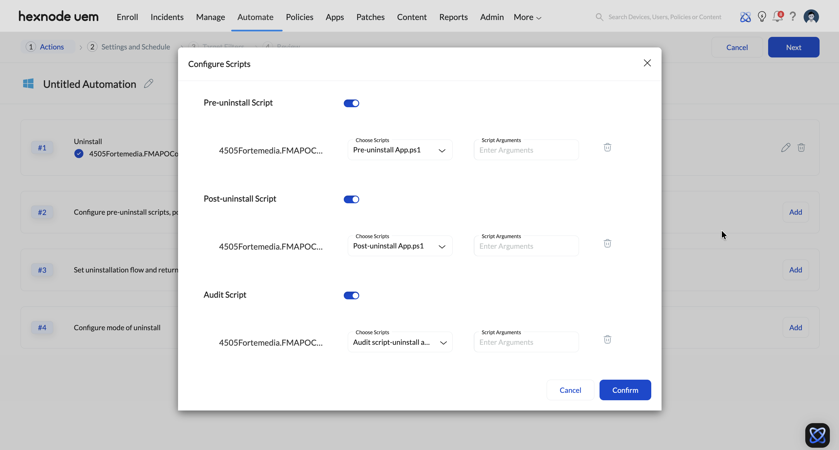 - The Fix: Utilize Audit Scripts. Return to the Configure scripts section of your automation and assign an Audit script from your repository. This actively scans the local environment for leftover directories immediately after the sequence, ensuring the Hexnode portal logs a verified, accurate status.