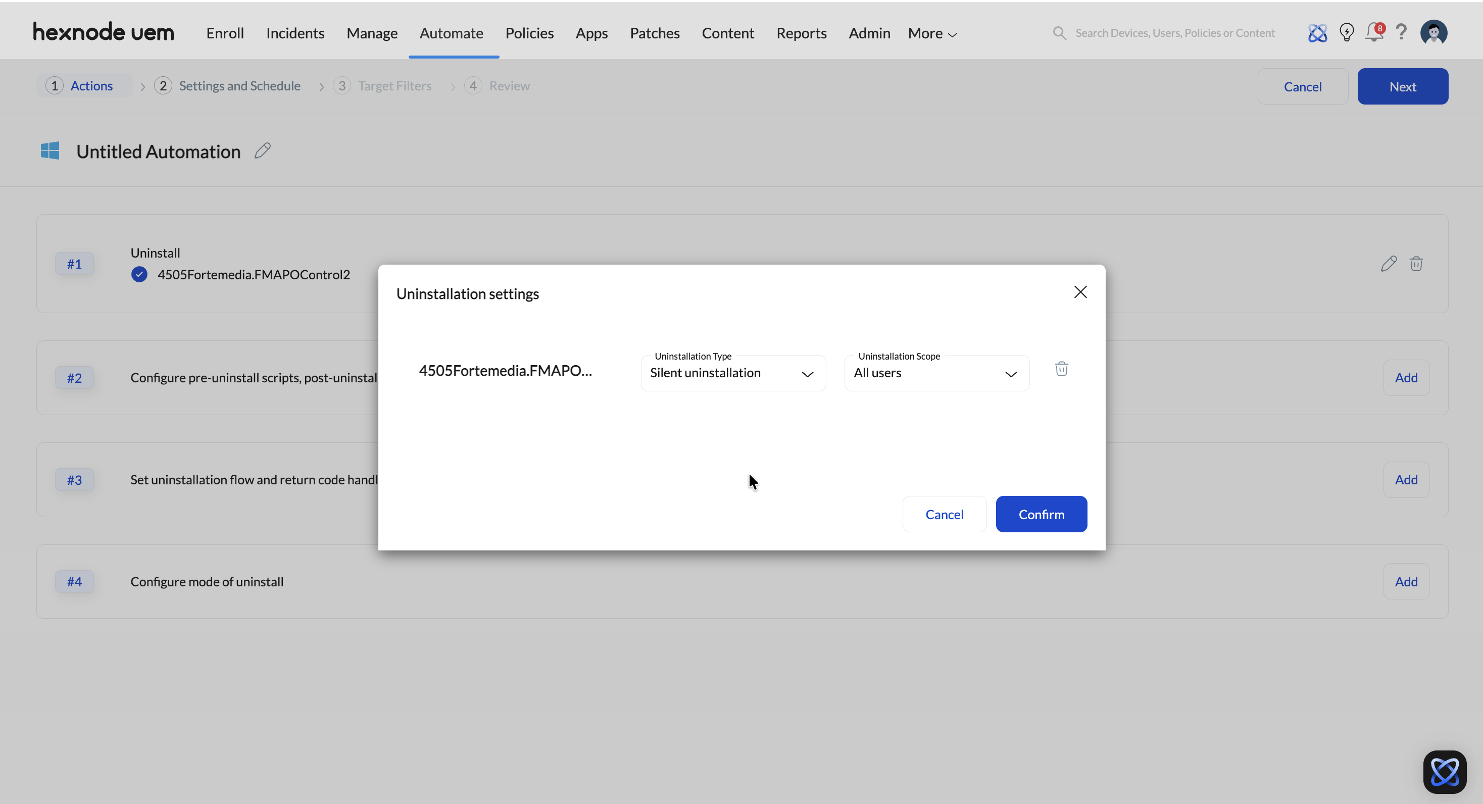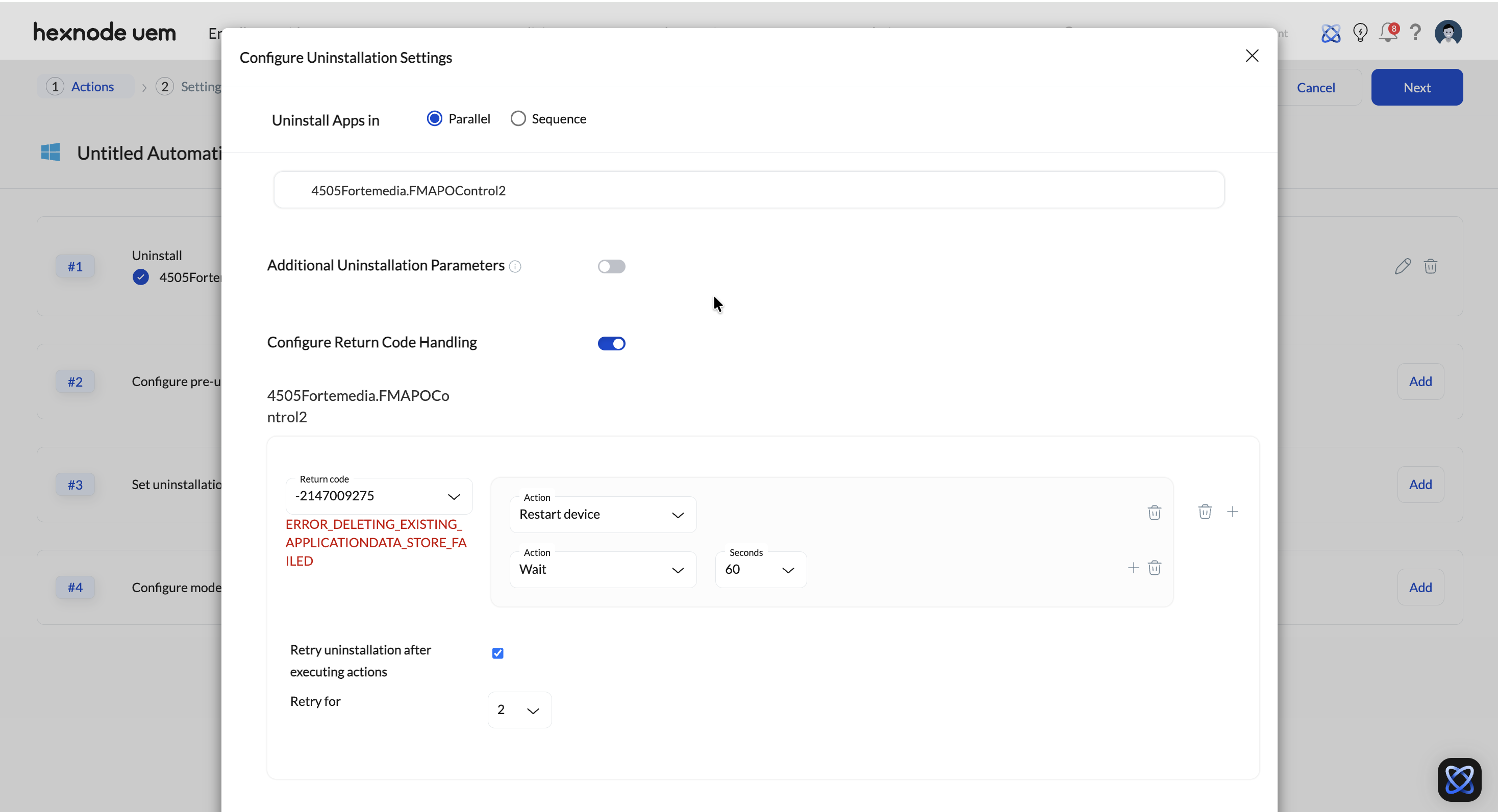 Automating App Uninstallation in Hexnode UEM is a workflow to automatically remove applications from Windows devices with controlled execution and error handling. Unlike the basic Uninstall Application action (under App Management), which only runs an uninstall command and uninstall string, this advanced workflow supports execution order (parallel or sequential), pre/post-uninstall scripts, custom command-line parameters, and return code-based actions like retries or device restarts.