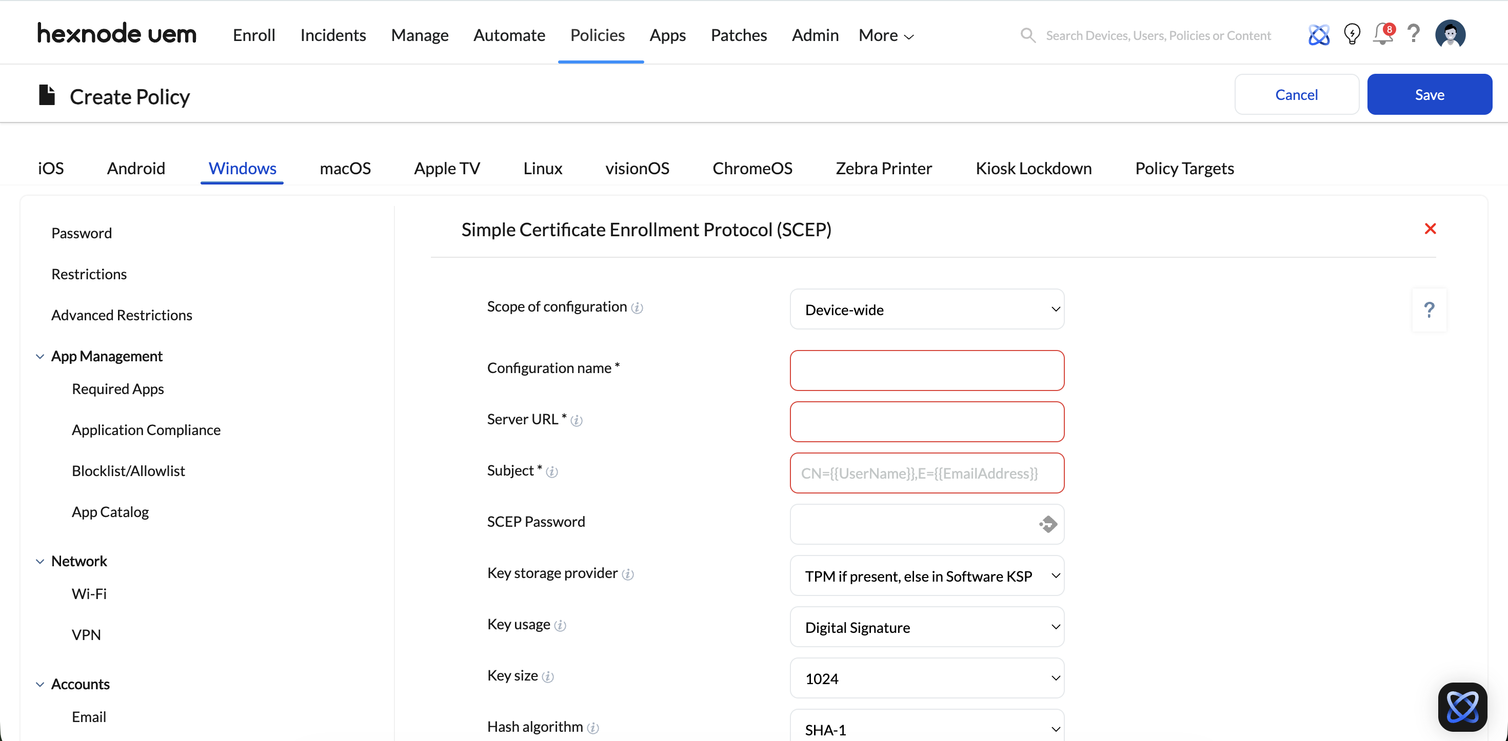 - Create SCEP Policy: Navigate to Policies > [Platform] > Security > SCEP.