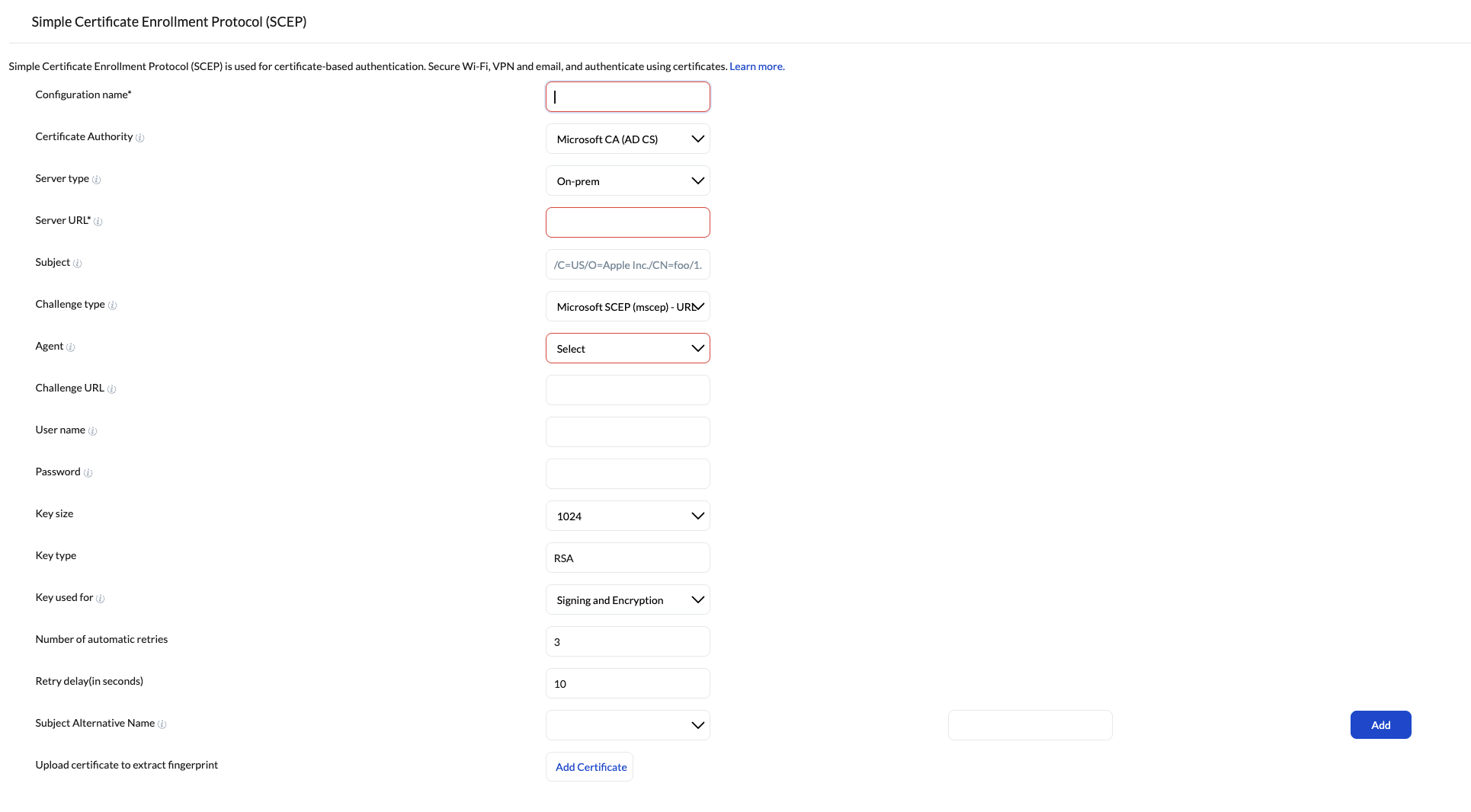 - Trust Verification: To prevent Man-in-the-Middle (MitM) attacks during bulk enrollment, the strategy requires injecting the Root or Intermediate CA certificate fingerprint directly into the payload. This ensures all 1,000+ devices mathematically verify the SCEP server’s identity before initiating a Certificate Signing Request (CSR).
