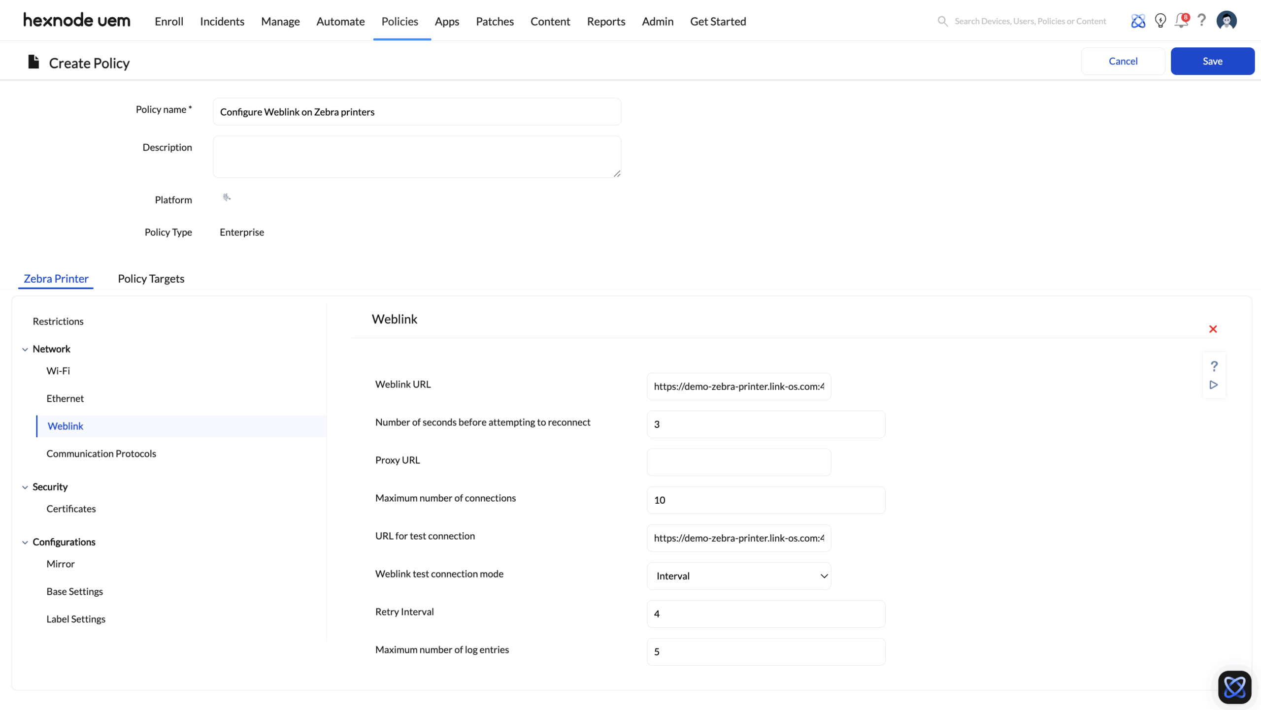 Weblink feature is a vital component for modern, connected Zebra printing environments. It empowers Link-OS printers to establish direct connections with internet or intranet-based servers, eliminating the need for intermediary host PCs. Through Hexnode UEM, administrators can efficiently configure weblink on zebra printers across their entire fleet. This ensures consistent connectivity settings and facilitates rapid deployment without requiring physical access to each device. This policy directly addresses critical challenges such as centralized management and ultimately enhancing operational efficiency.