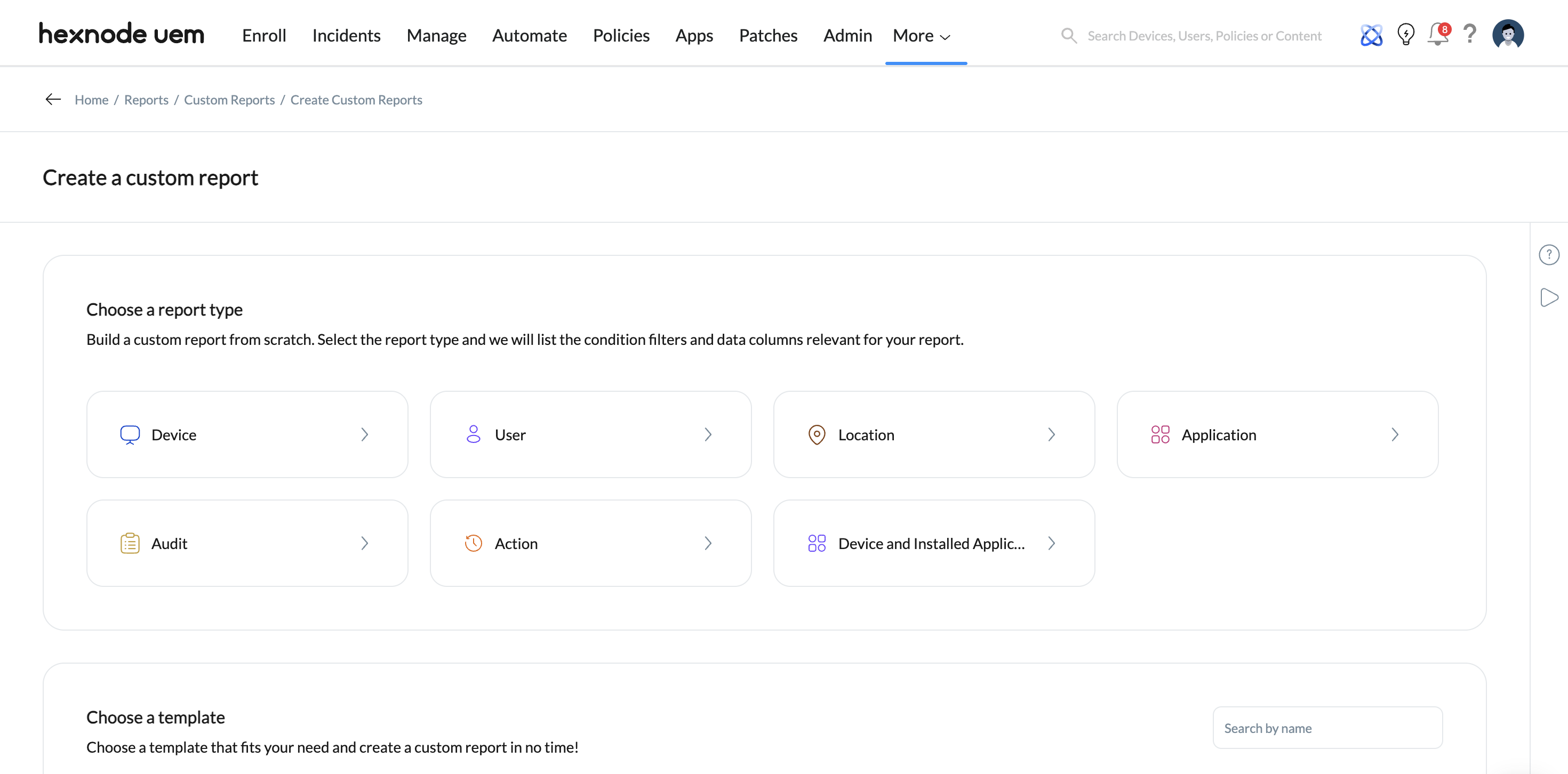 - Custom Reports: Hexnode allows the creation of tailored reports under the Reports > Custom Reports module.