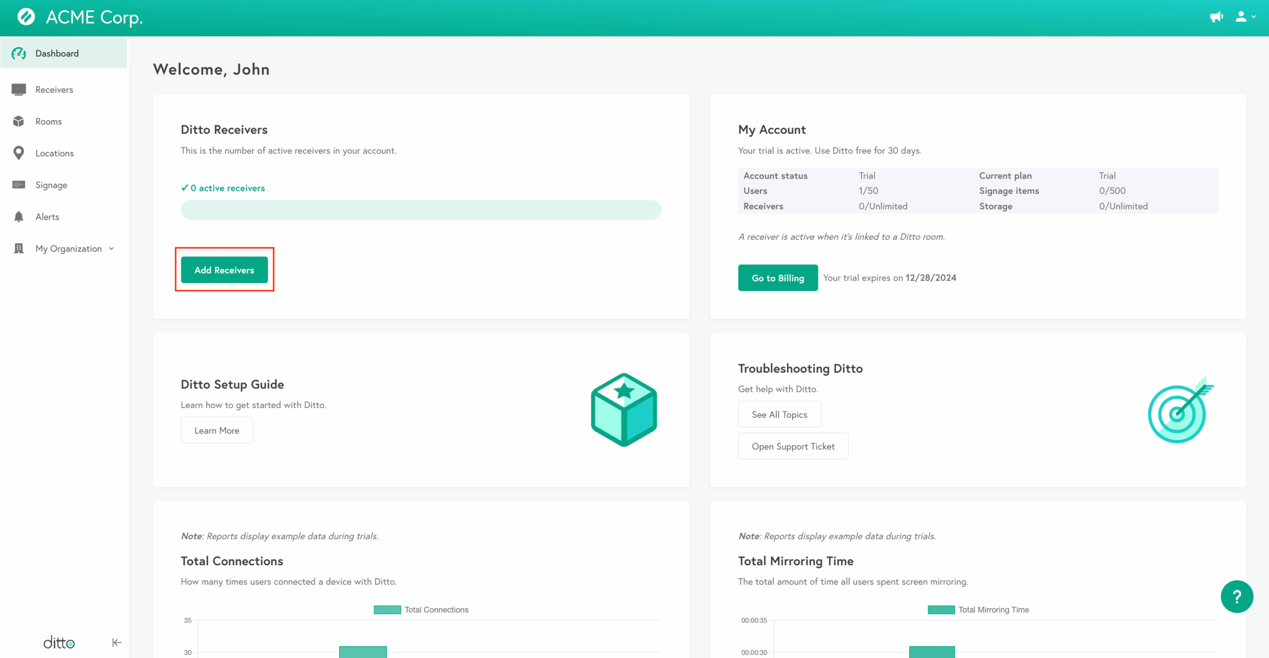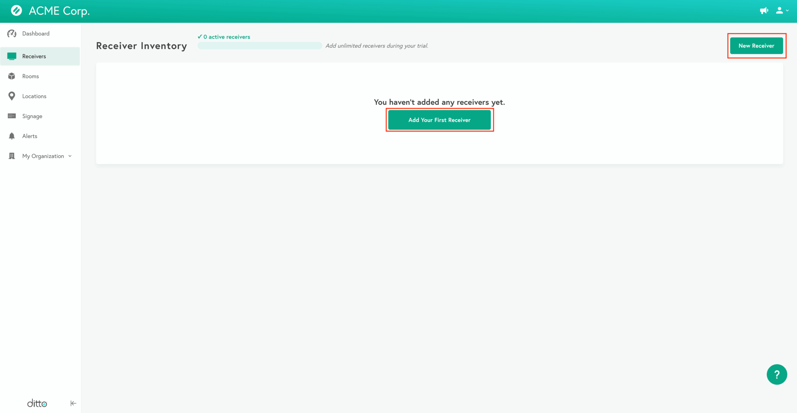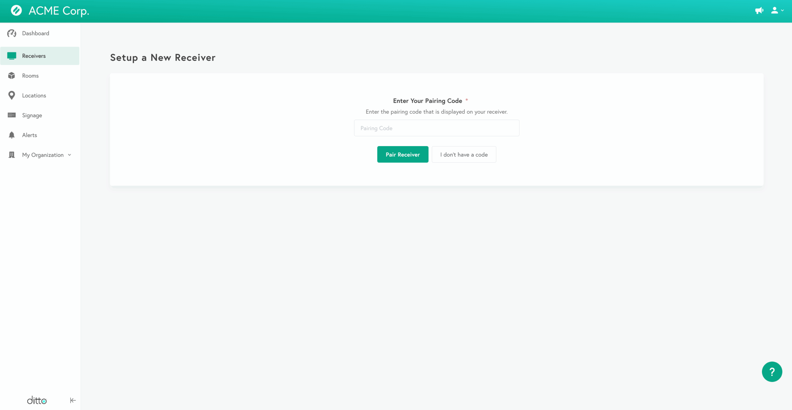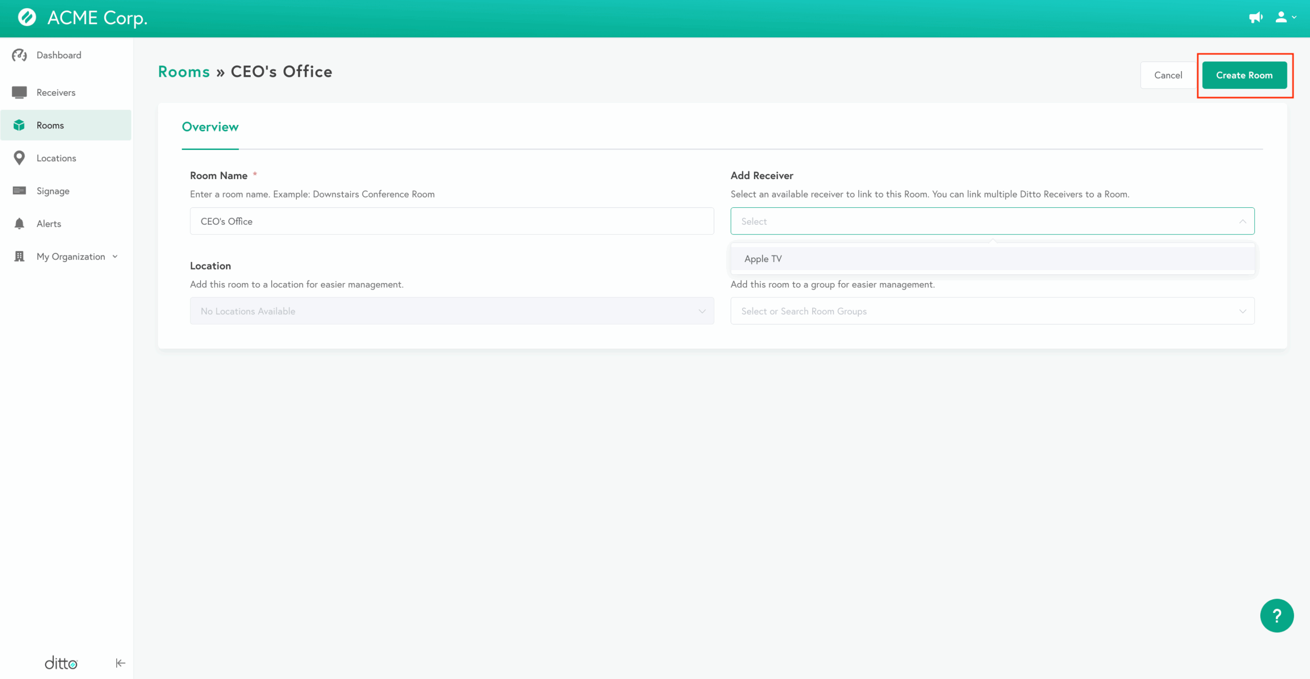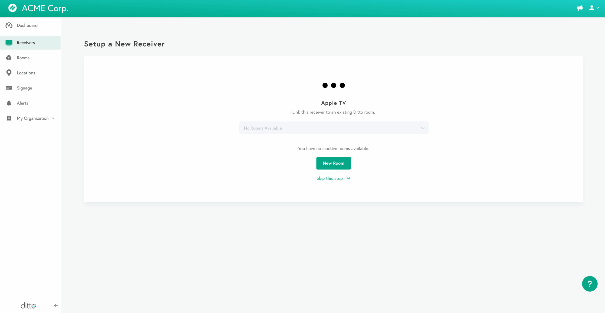 - Add Receiver: Add a receiver to this room. This is how you make a room active. A receiver is simply the device in the room that Ditto connects to.