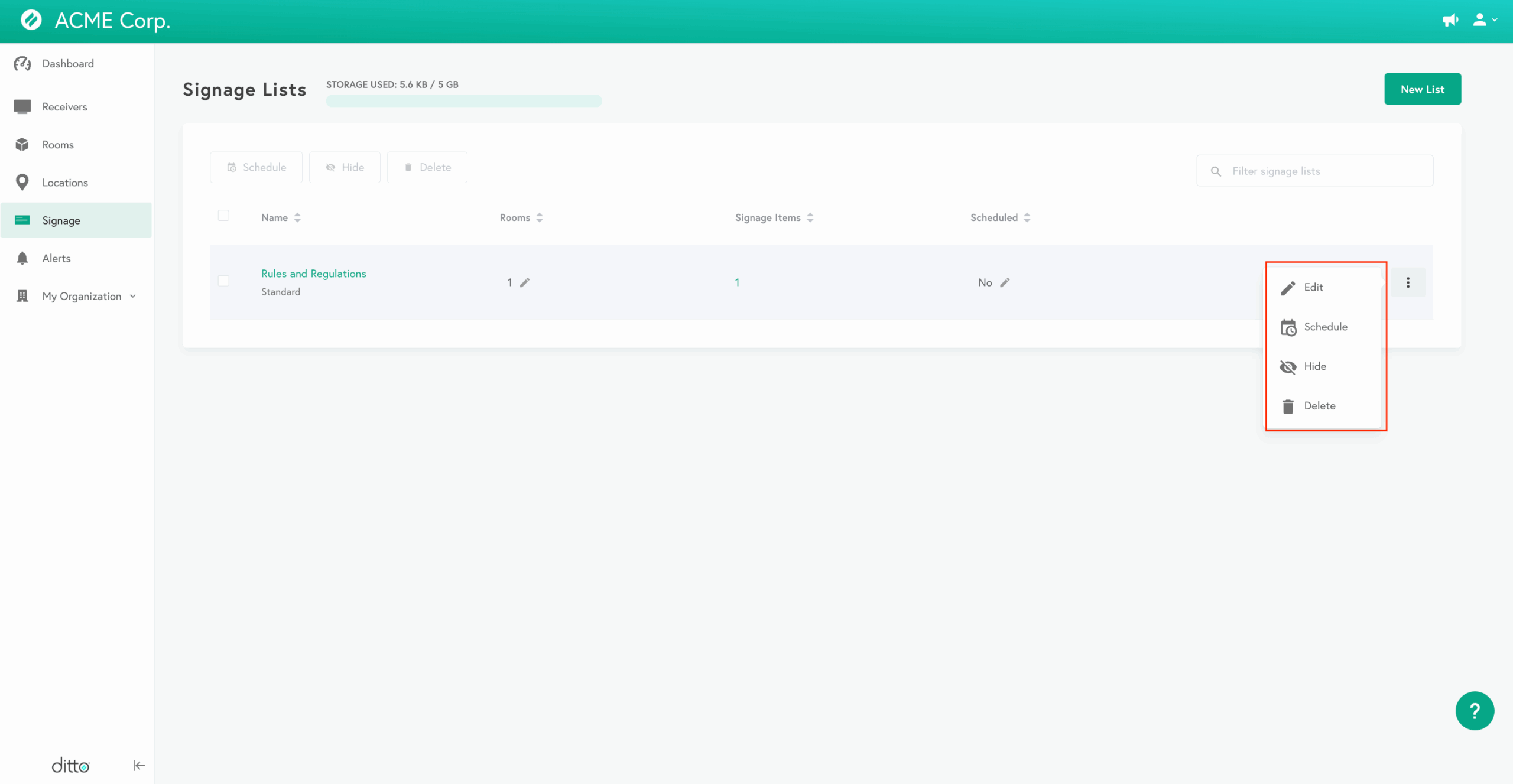 - You can Edit, Schedule, Hide, or Delete the added signage list by clicking on the list.