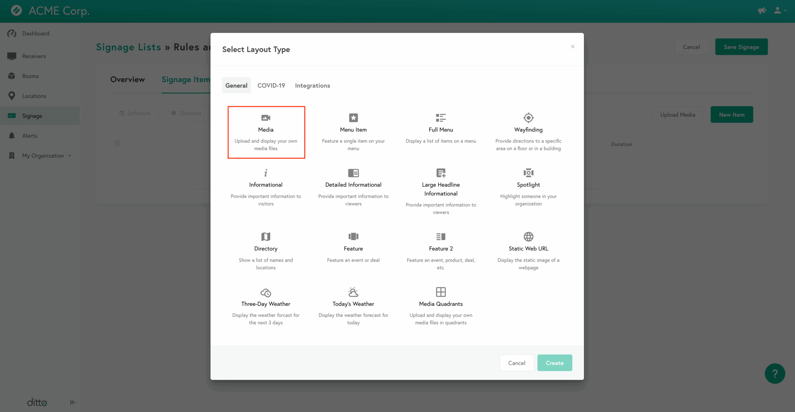 Once the steps are performed, the chosen digital signage items will start displaying on the Ditto rooms assigned to the list.
