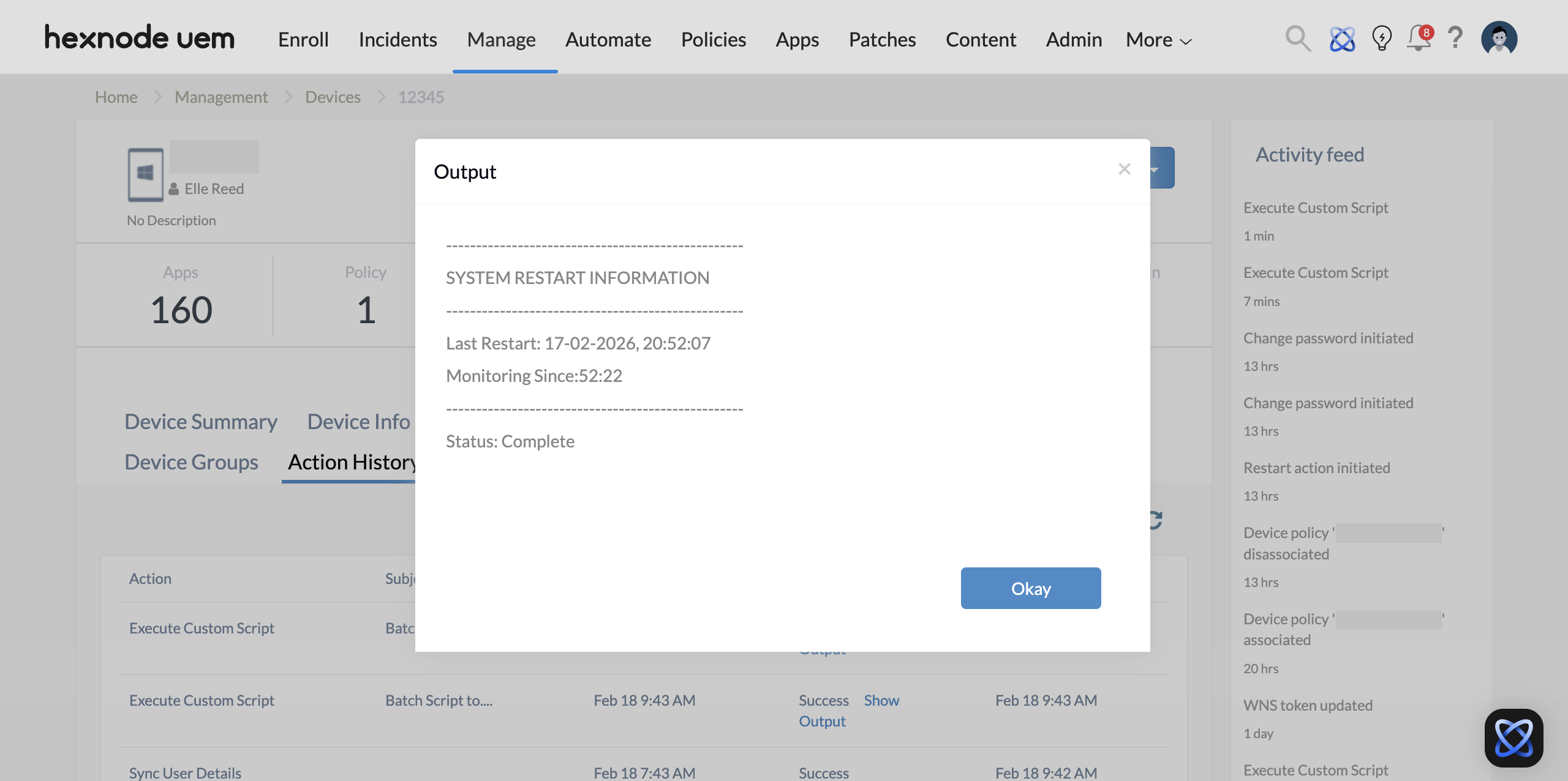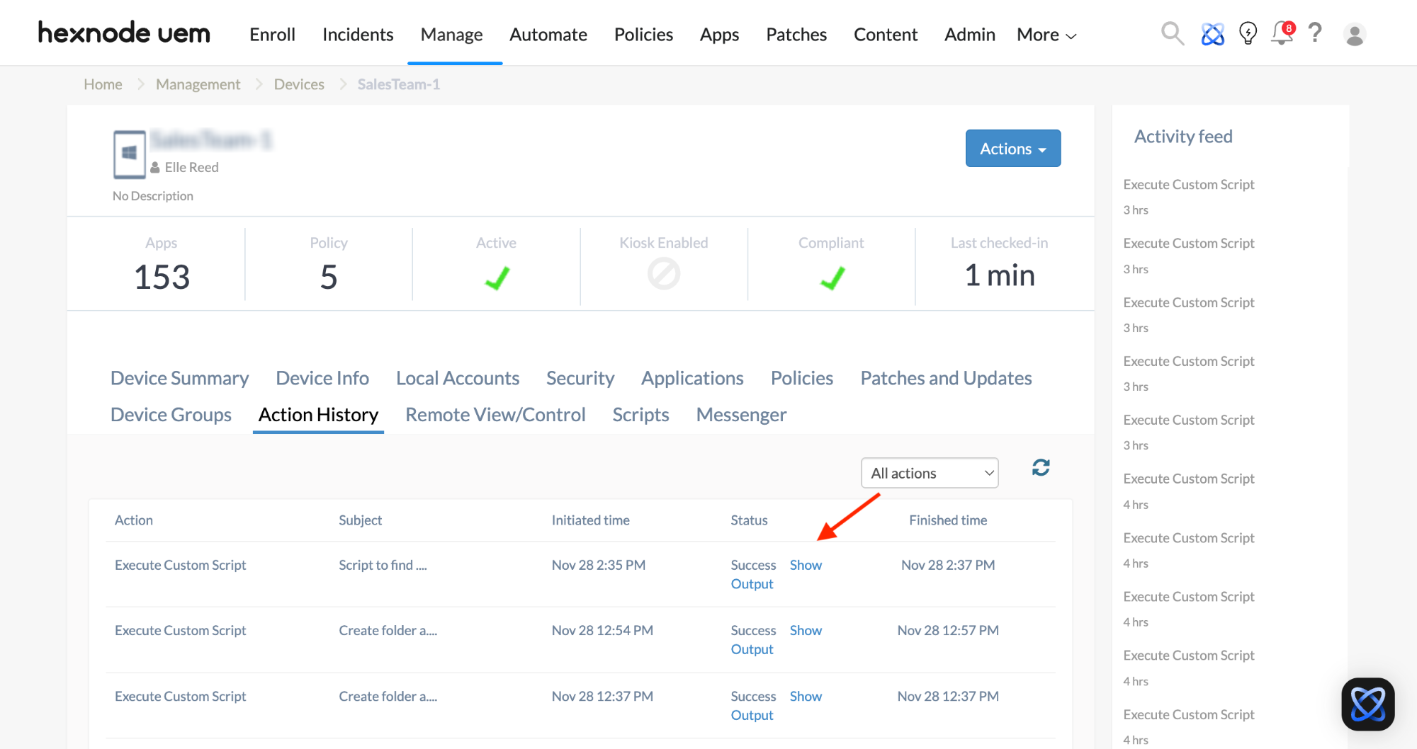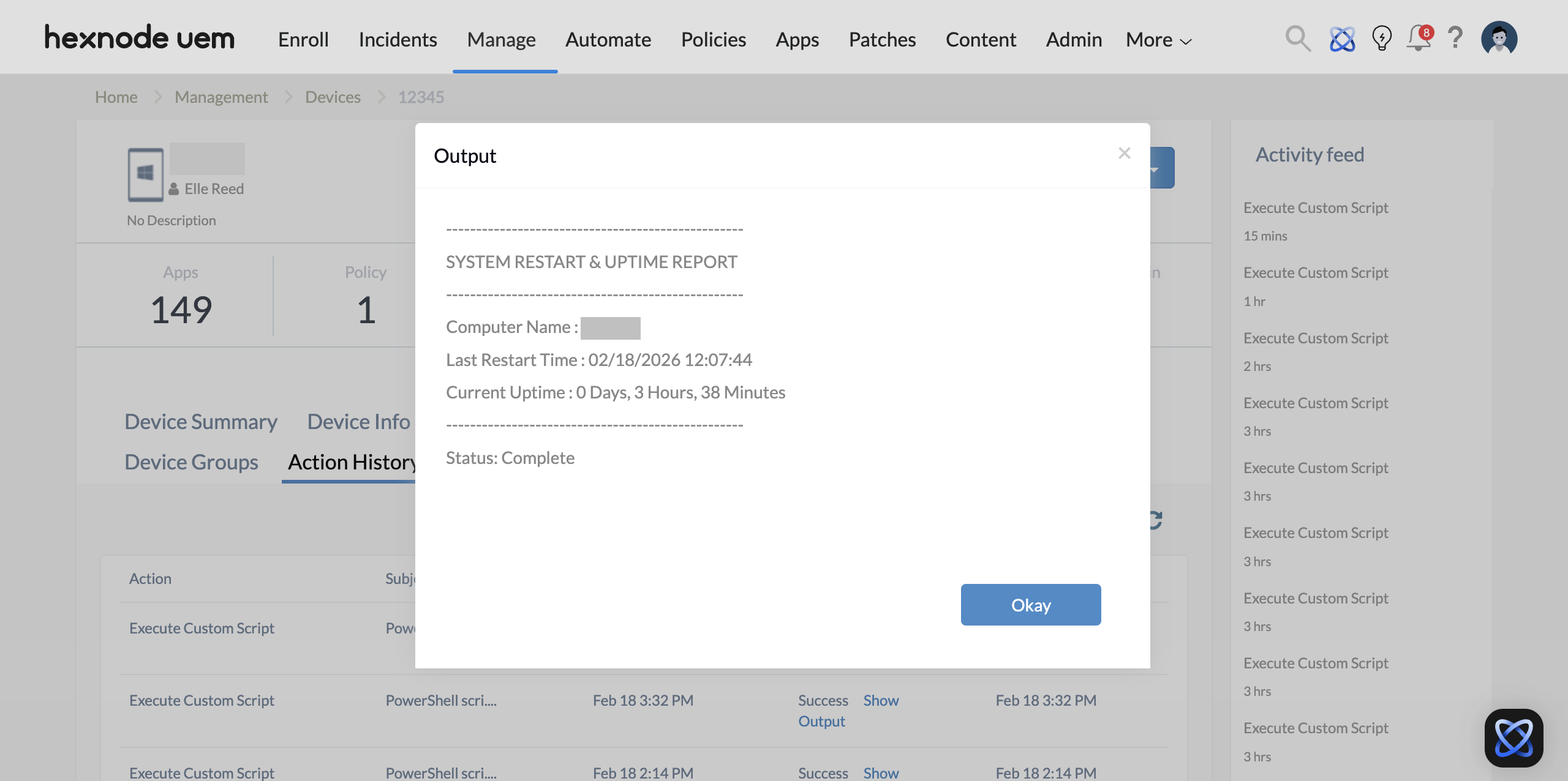 .ps1PowerShell script and click Execute. - The script output is available via Action History > Execute Custom Script action > Status > Show Output.