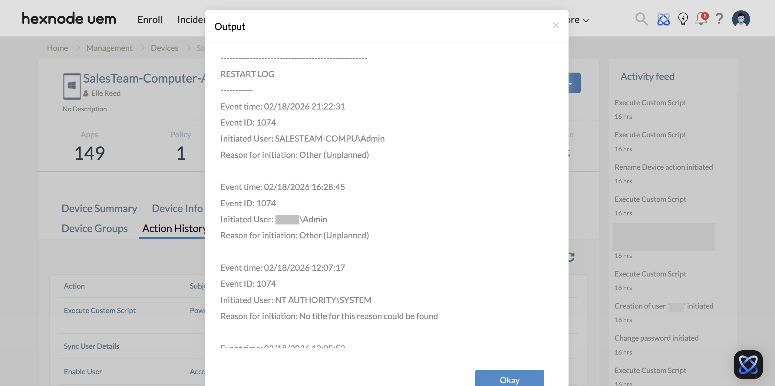 Get-WinEventcommand, which provides a detailed audit trail of every restart since the device was enrolled in Hexnode. This log identifies the specific date and time of each event along with the name of the user or system process that initiated the restart.