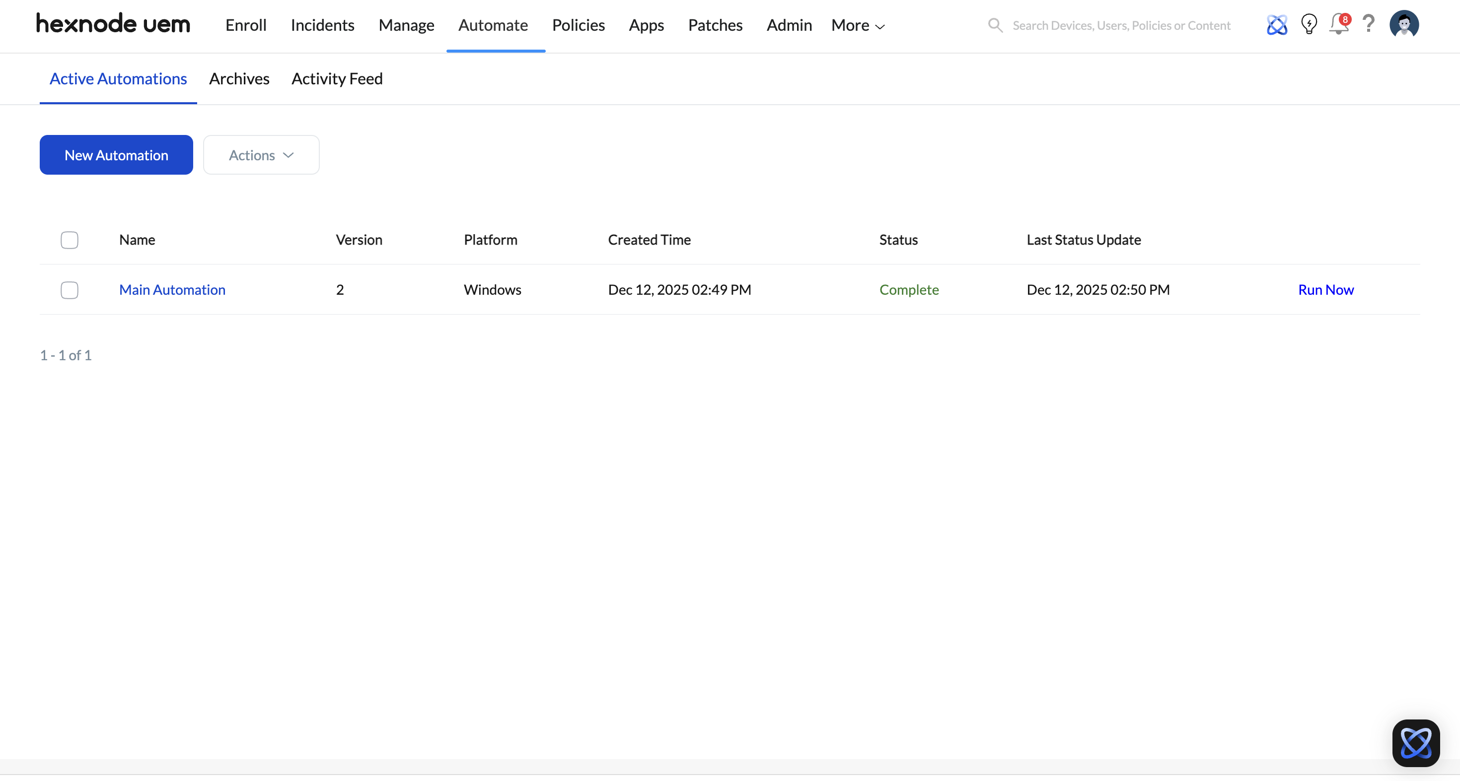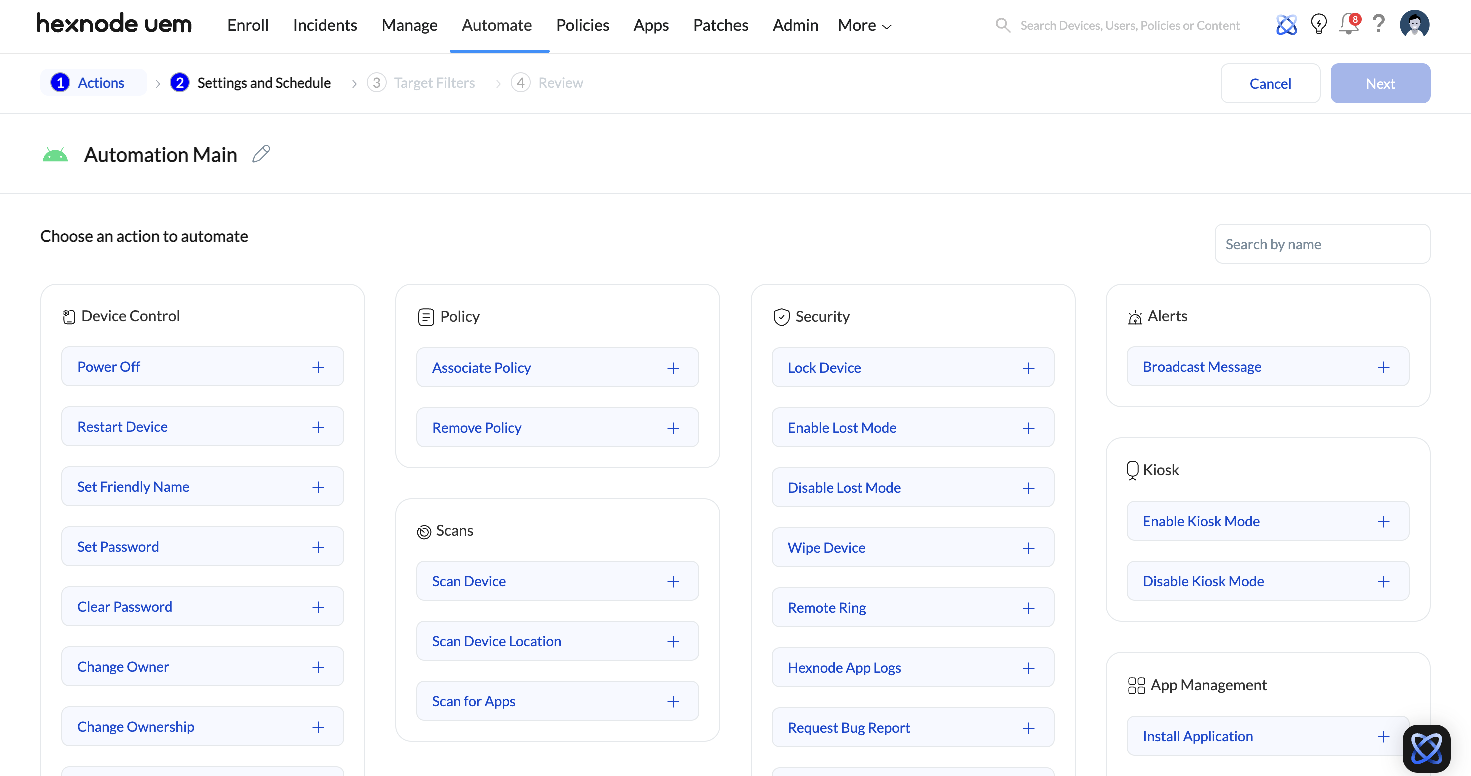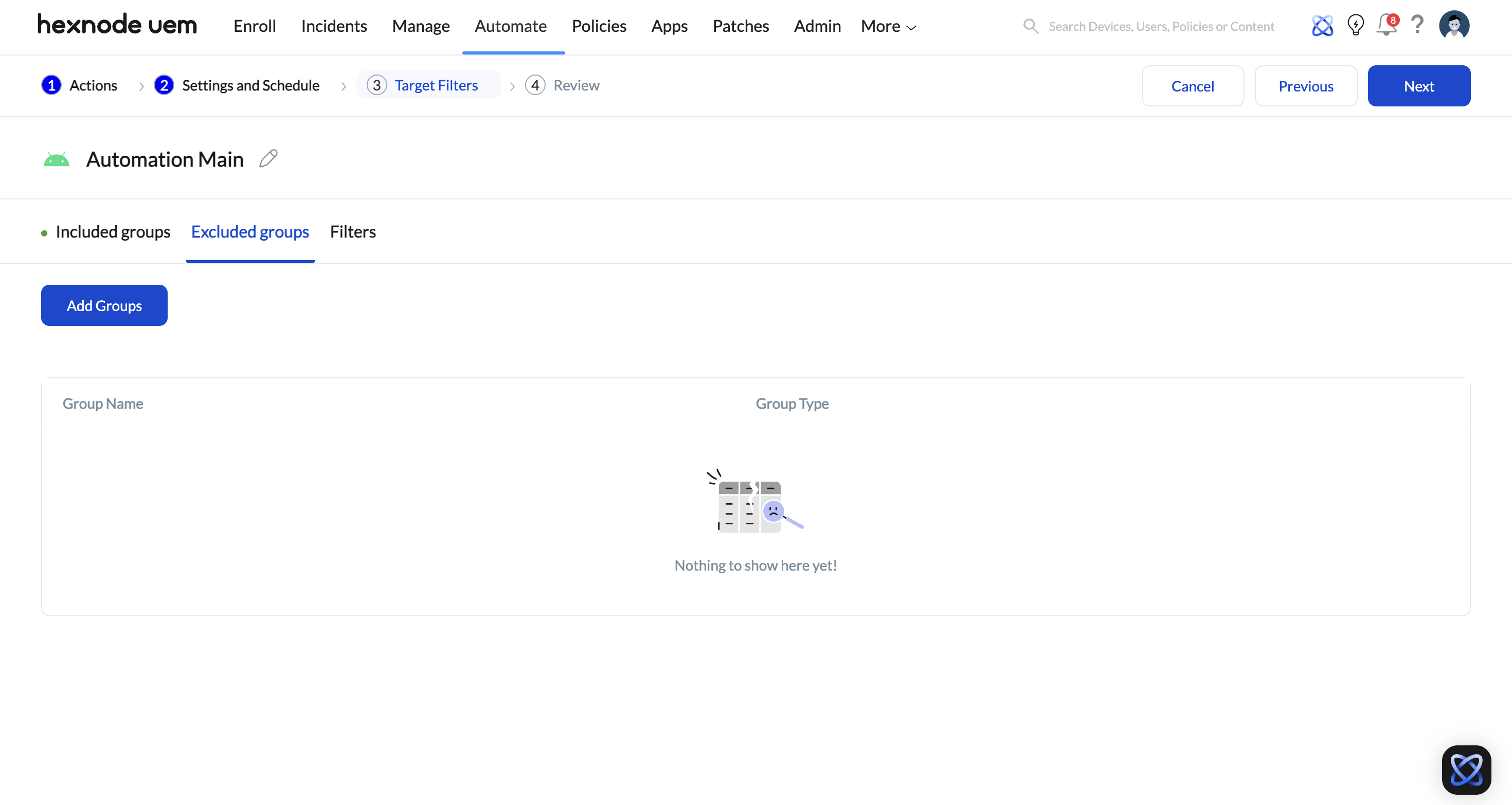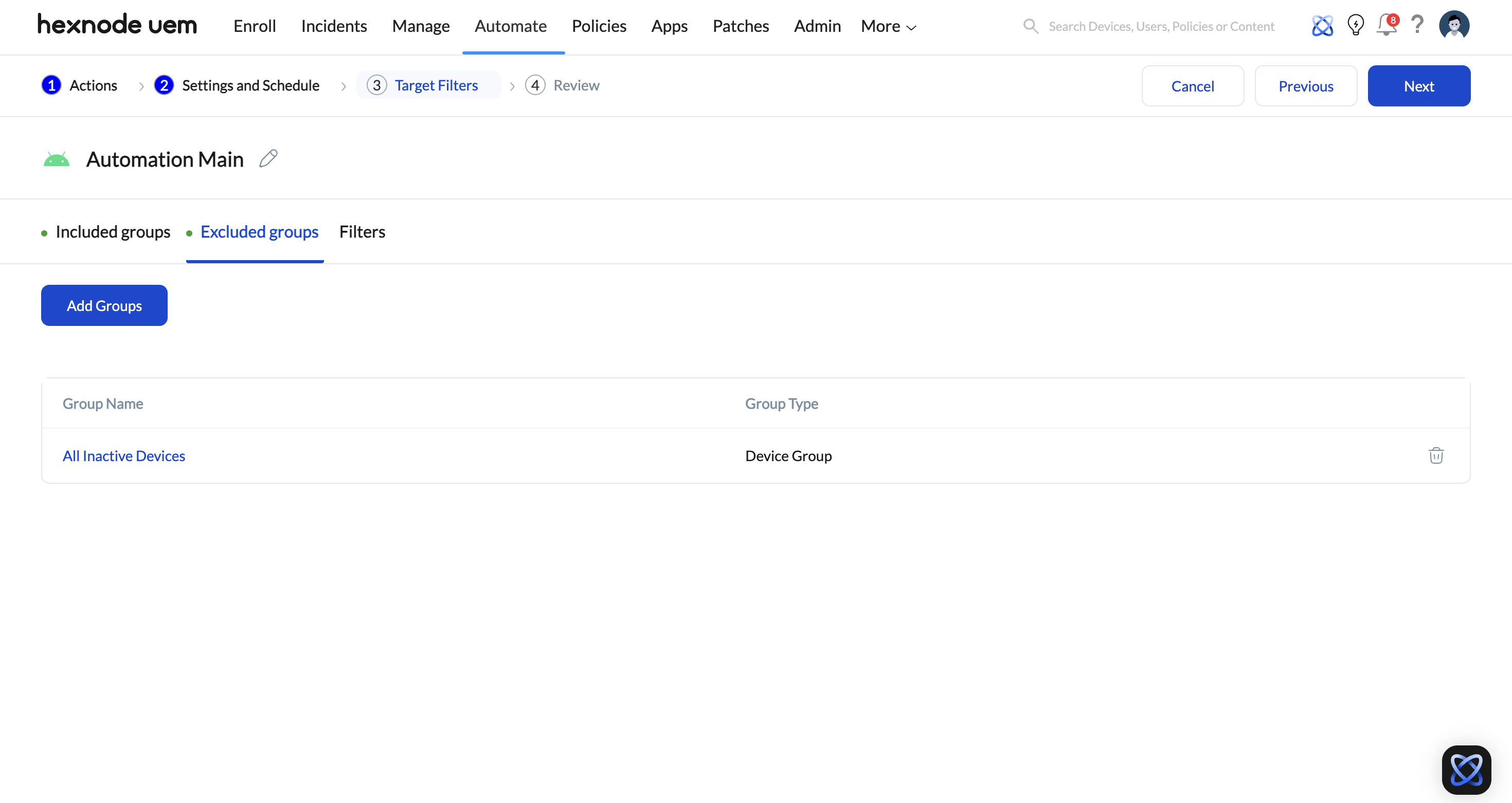 The Automate feature in Hexnode is used for scheduled tasks, such as bulk policy associations or script deployments. The “Exclude Groups” feature here is the most powerful tool for ensuring that automated maintenance cycles do not disrupt mission-critical devices.