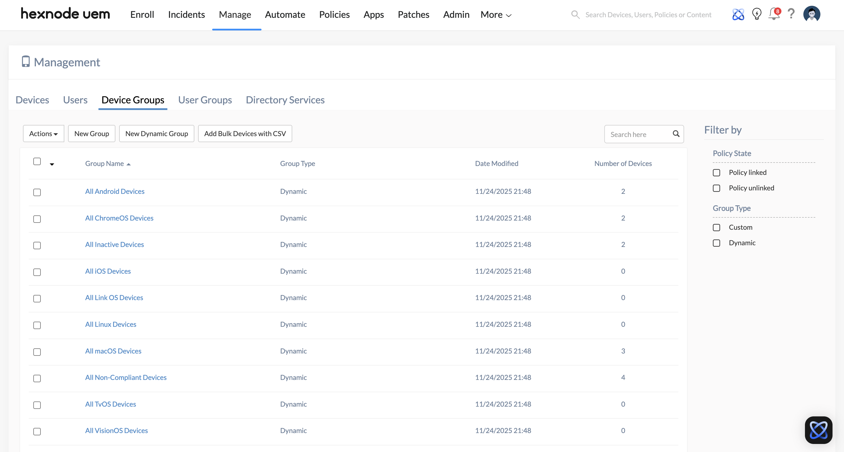 - Navigate to Manage > Groups > Device Groups.