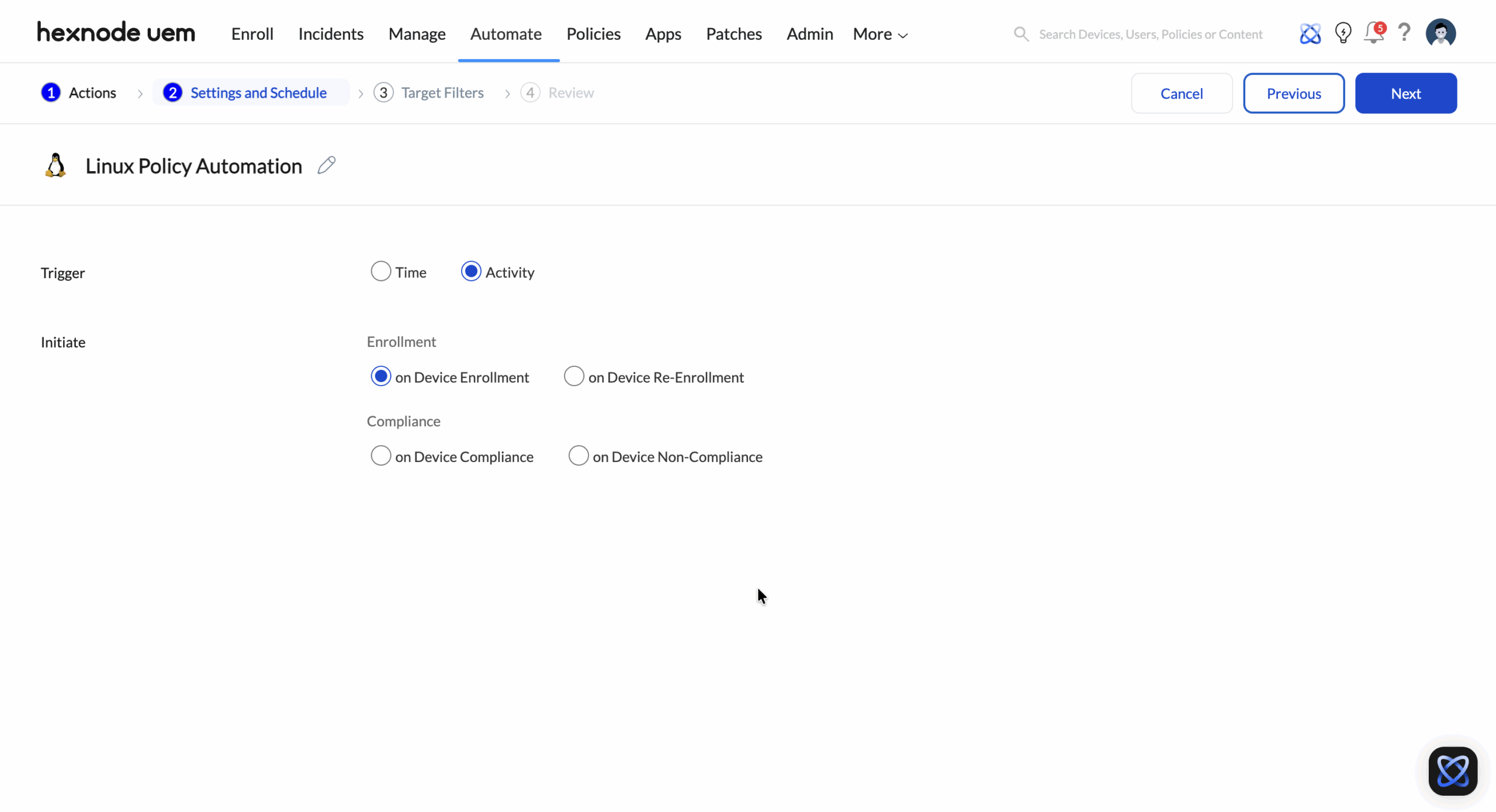 5. Automation Rules: Set up Hexnode Automate to trigger remediation scripts based on device compliance.