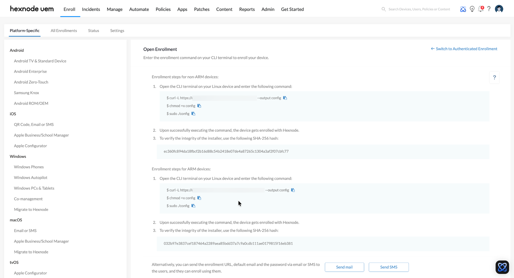 • Agent-Based Communication: Devices are onboarded via CLI-based enrollment. Once the agent is installed, it establishes a secure, persistent communication channel with the Hexnode UEM server.