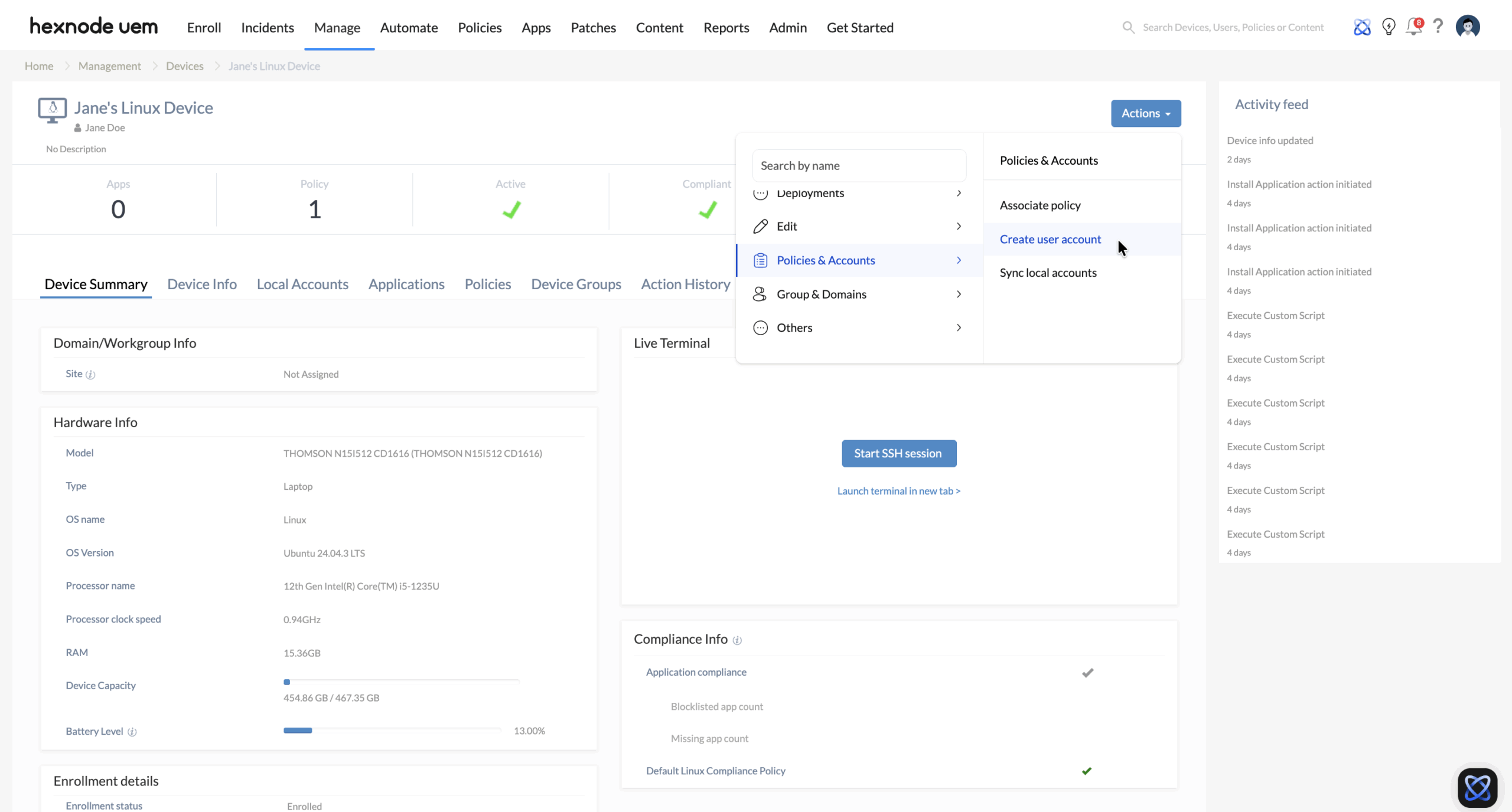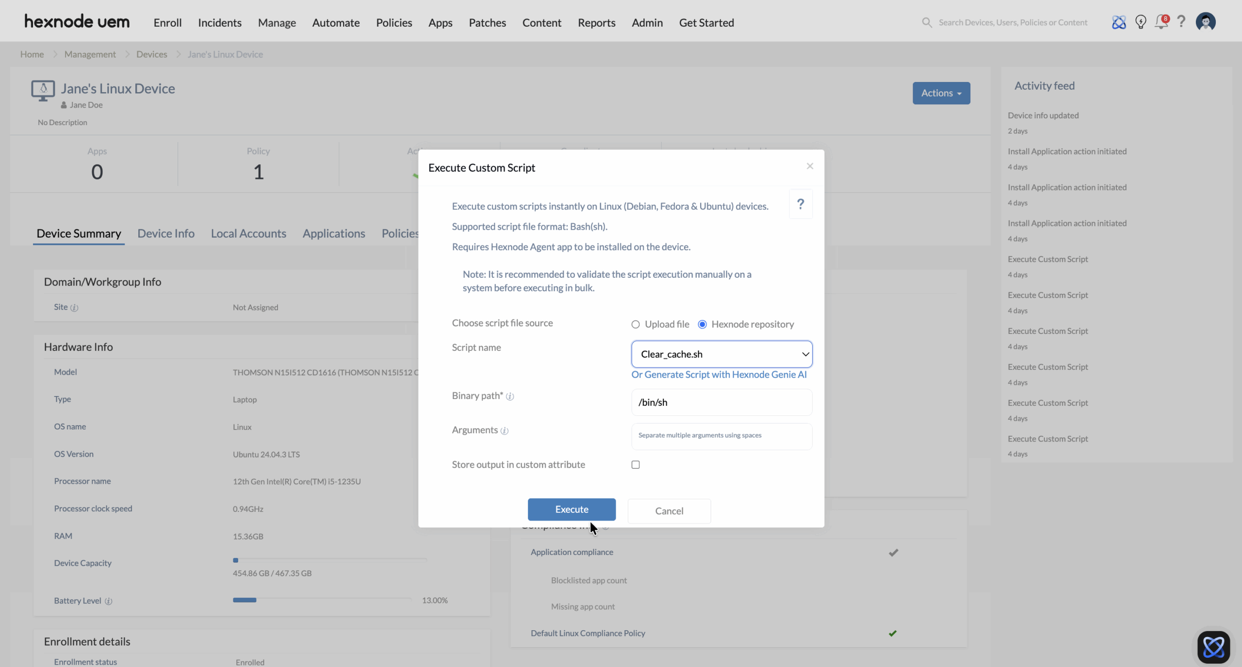 • Custom Script Execution: Hexnode supports the deployment of Bash (.sh) scripts on Linux devices via Execute Custom Script action. This allows for mass execution of tasks like: