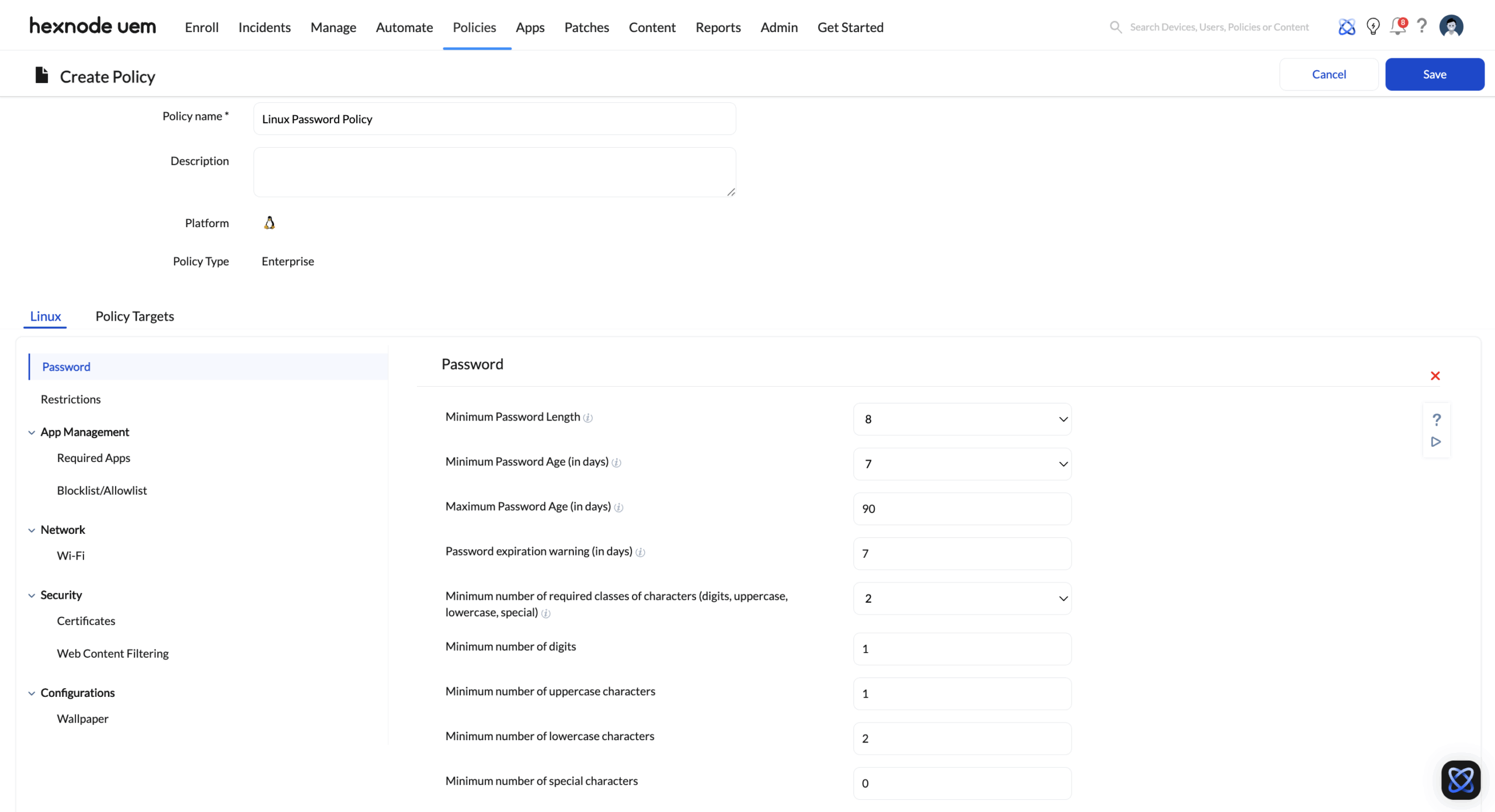 • Password Policy Enforcement: Centrally define and deploy complexity requirements, rotation schedules, and lockout thresholds. These configurations ensure that all Linux endpoints adhere to corporate security standards without manual configuration at the CLI level.