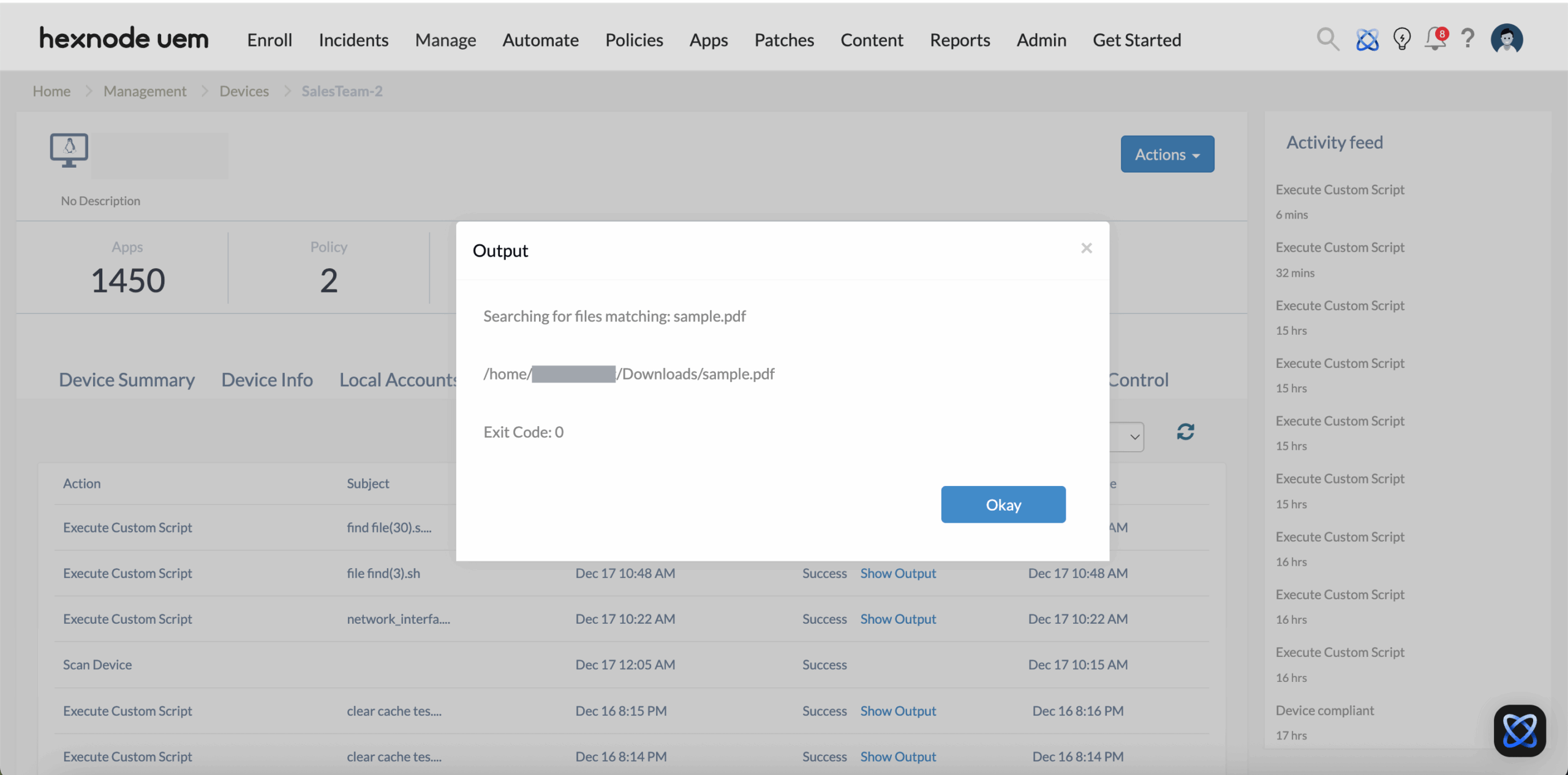 After the script is triggered, go to the Action History tab in your Hexnode portal. Find the script entry and click Show Output to see the list of file paths.