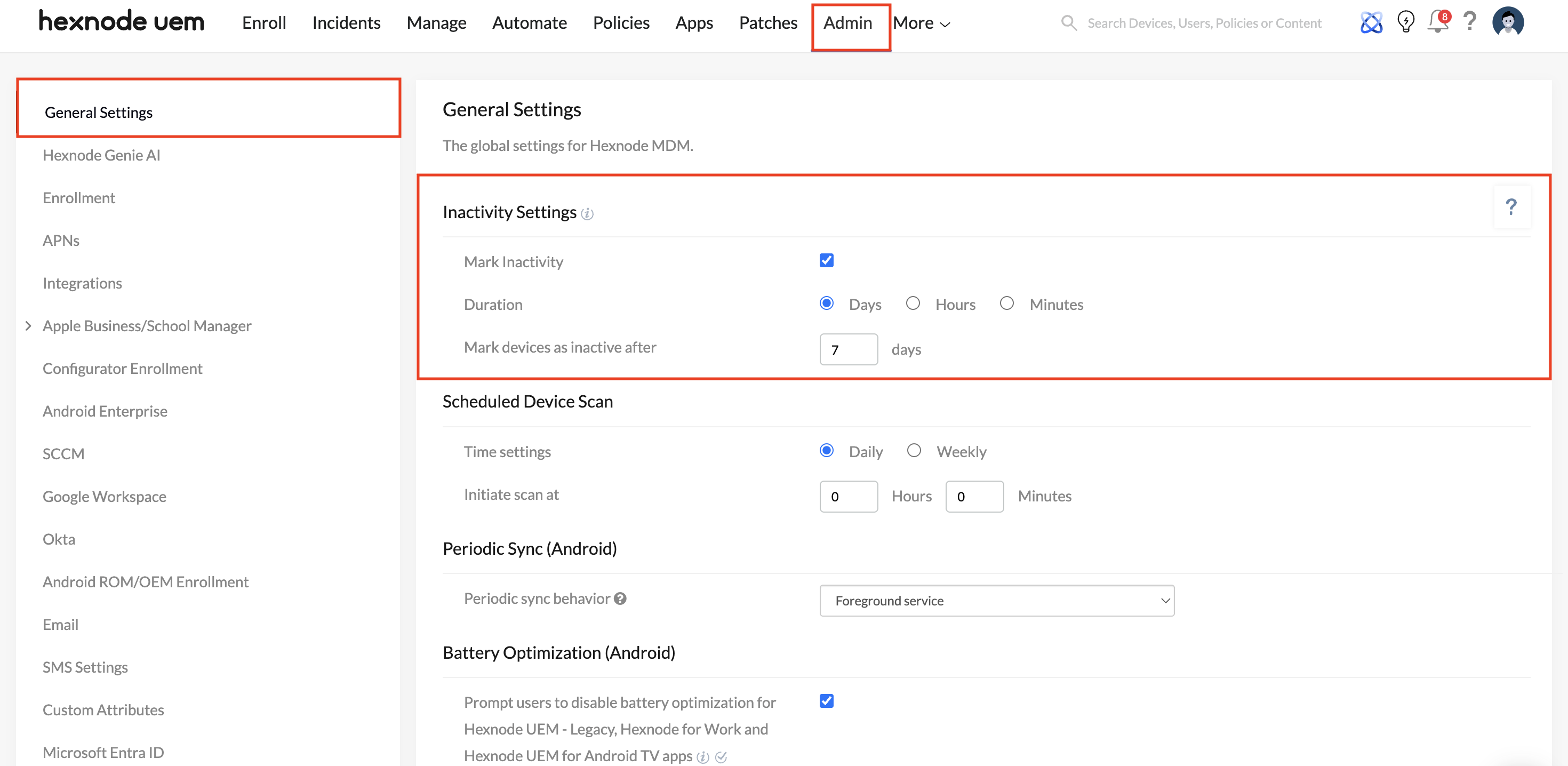 - Hexnode UI Path: Admin > General Settings > Inactivity Settings