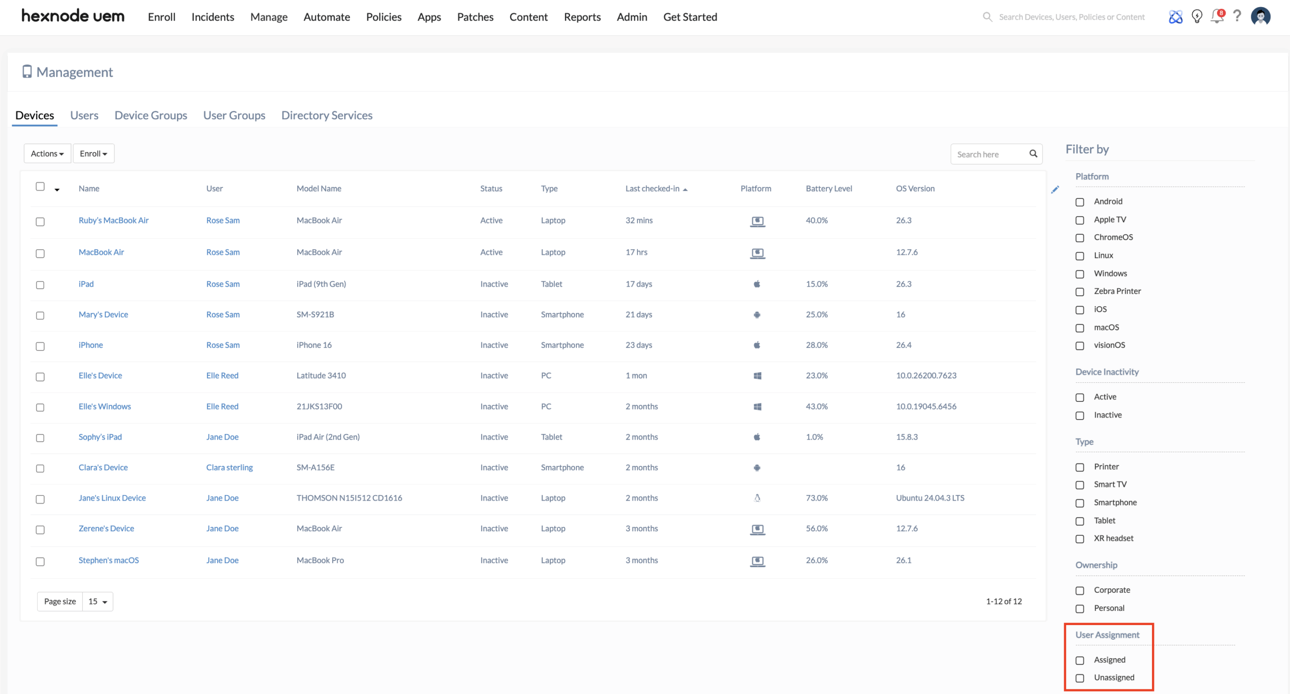 - Identifying Assets: In the Hexnode UEM console, administrators navigate to Manage > Devices. By using the User Assignment filter, IT can quickly toggle between Assigned and Unassigned devices. Any device previously belonging to a deleted user will now appear under the “Unassigned” list.