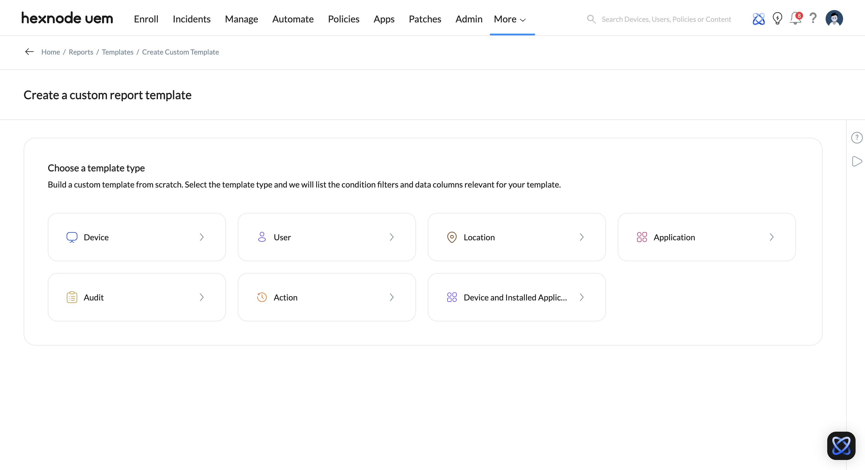 Custom report templates that allow IT admins to create and define their own report formats from scratch. |
