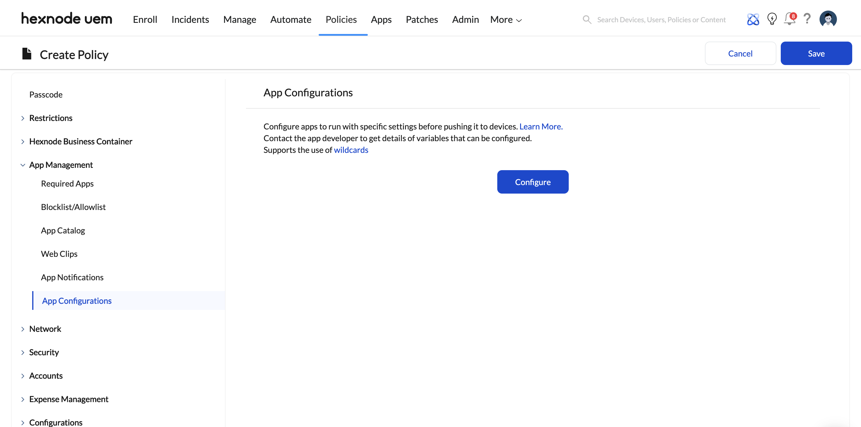 - Open your overarching security policy in Hexnode.