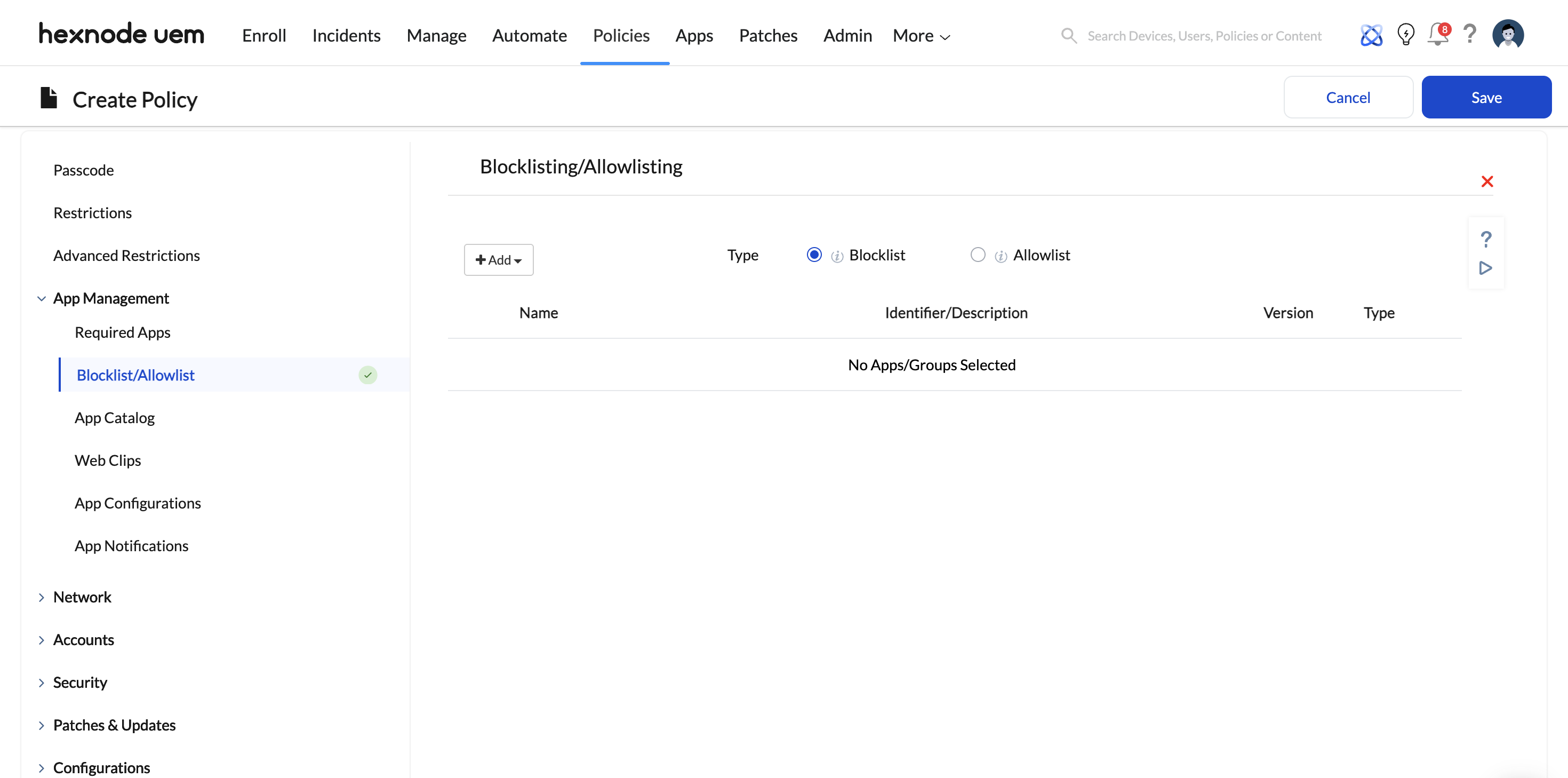 - Select Blocklist and add the applications you wish to prohibit. You can select apps directly from the Hexnode app inventory or specify app bundle IDs/Package Names.