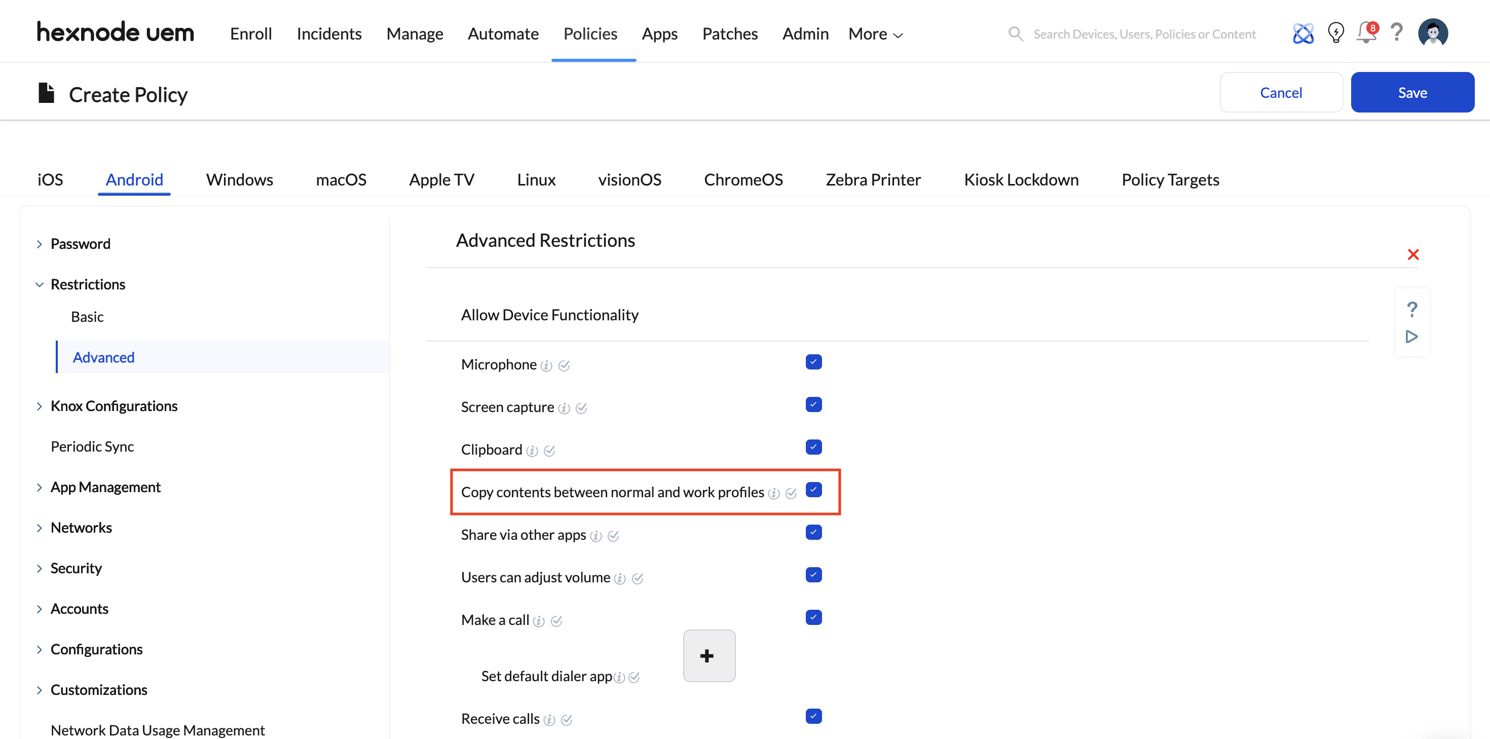 - Under Policies > Android > Restrictions > Advanced, ensure that cross-profile sharing restrictions are active. Personal apps outside the Work Profile are entirely blind to the data inside the work partition.