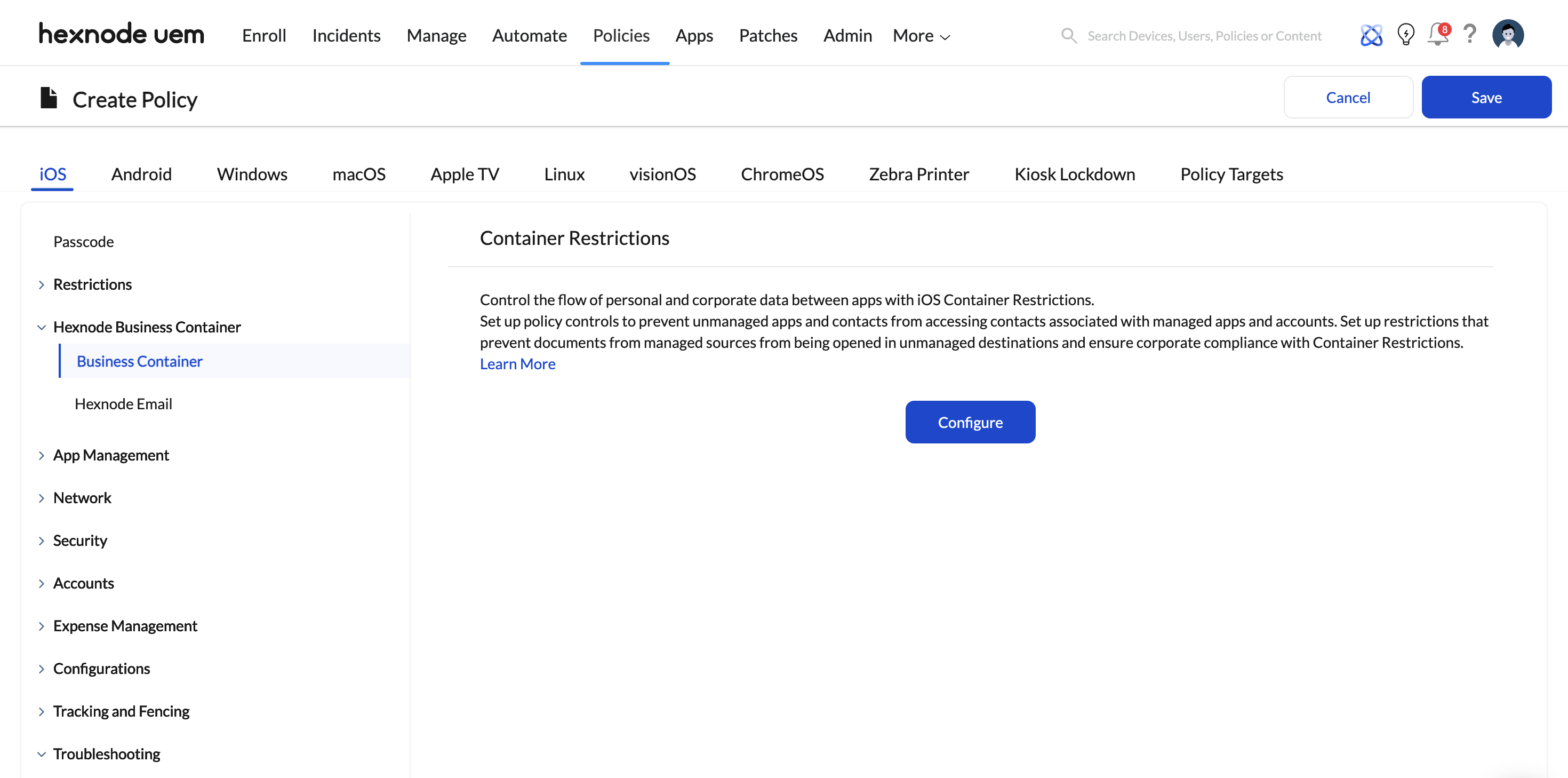- Navigate to Policies > iOS > Hexnode Business Container and click Configure.