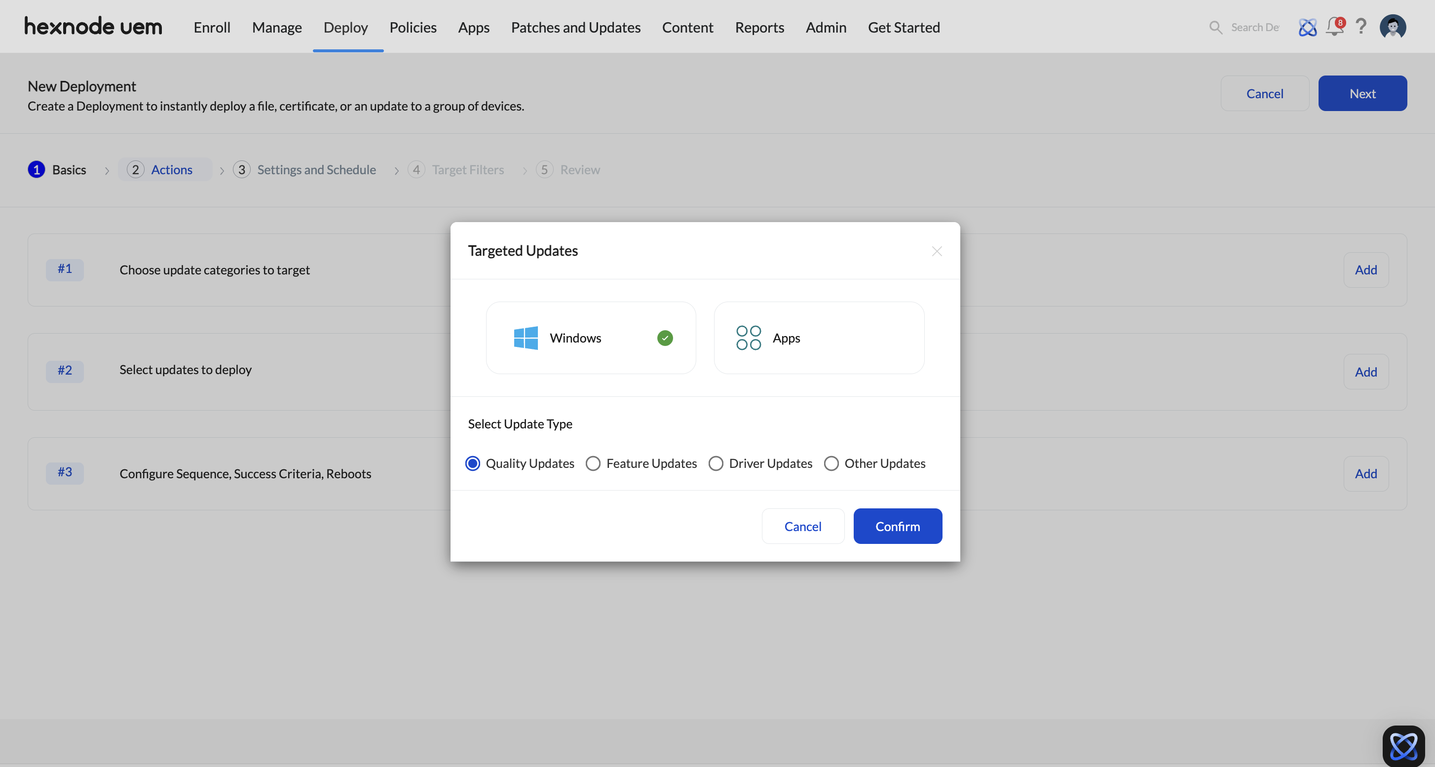 Manual patch deployment in Windows allows administrators to selectively install updates for the operating system and applications, helping with a controlled rollout. Whether an update needs to be installed immediately or tested on a specific set of devices before a wider deployment, Hexnode UEM’s manual patching provides an efficient solution.