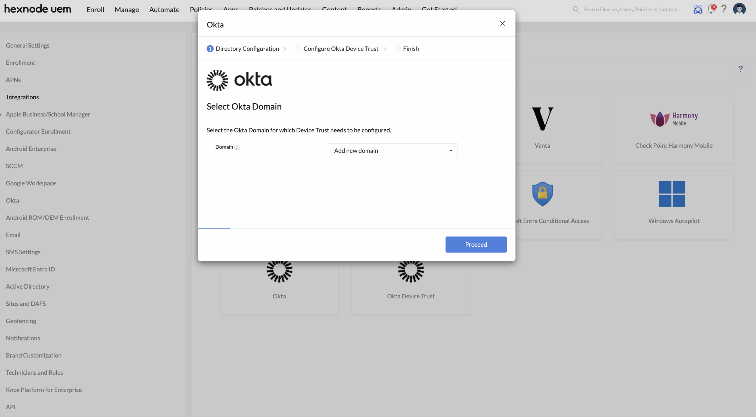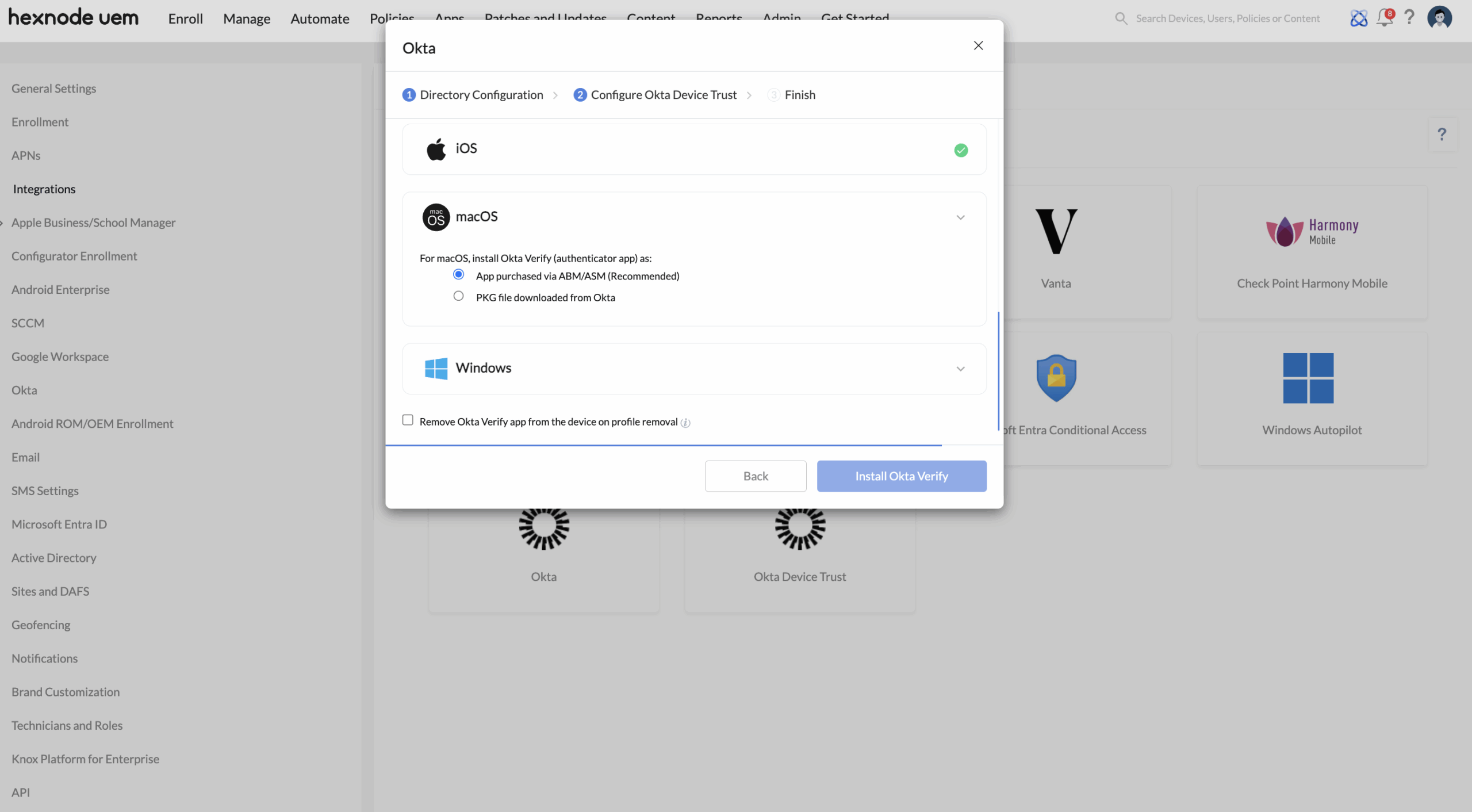 With the prerequisites in place and the roles of devices and Okta Verify clarified, we can proceed to configure Okta Device Trust with Hexnode UEM.