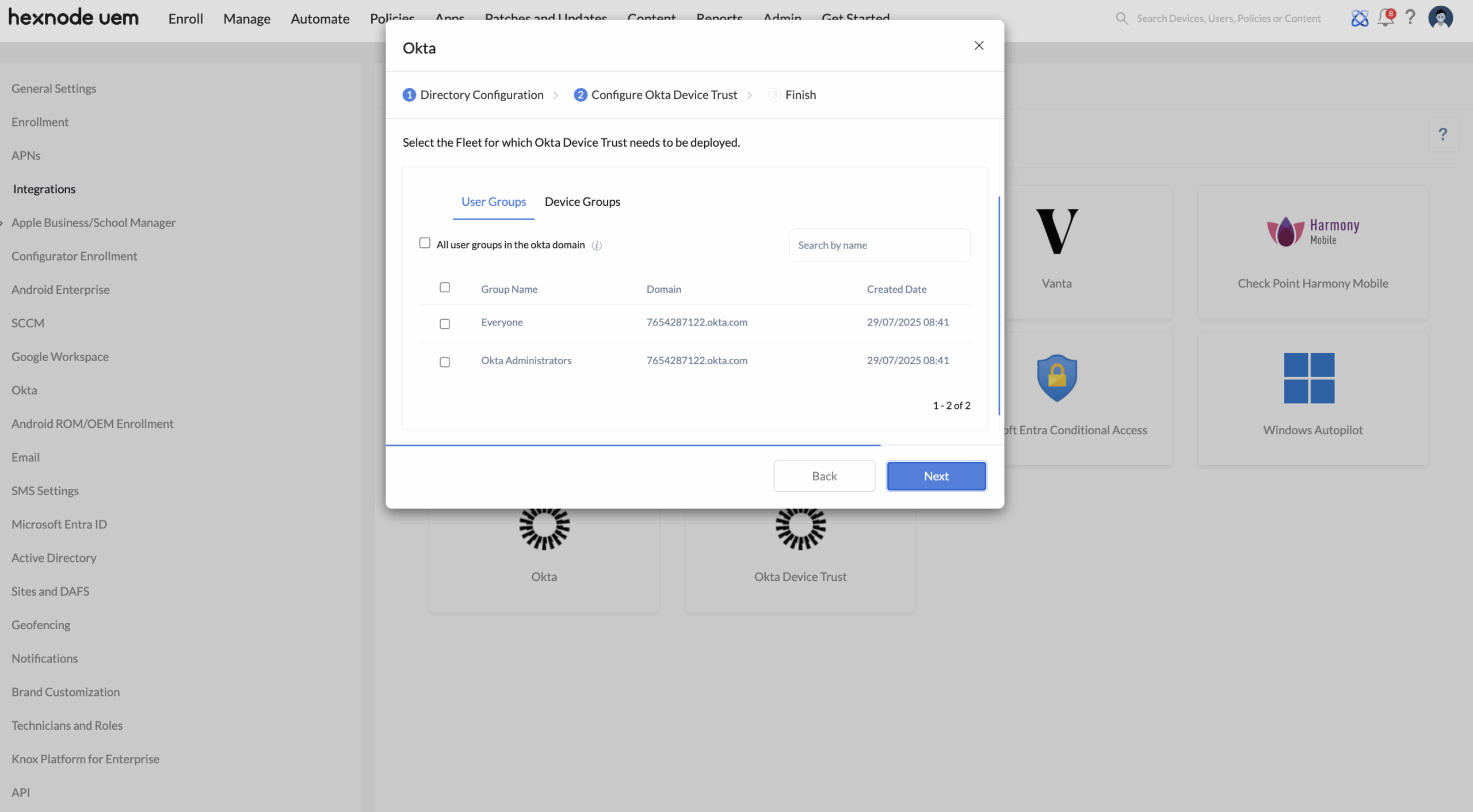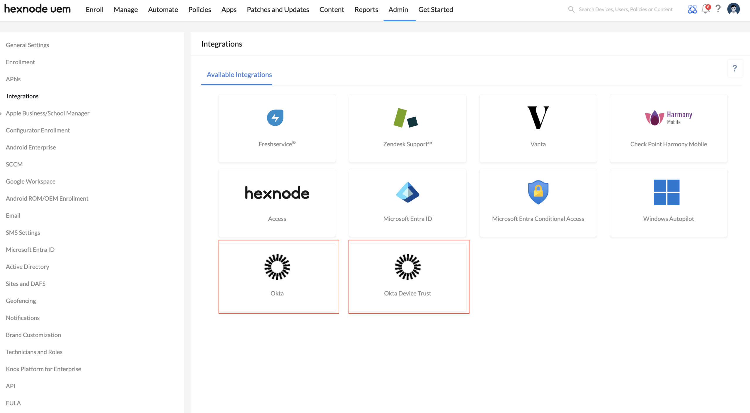 To begin, integrate your Okta account with the Hexnode UEM portal. For detailed steps, refer Okta Integration Guide.