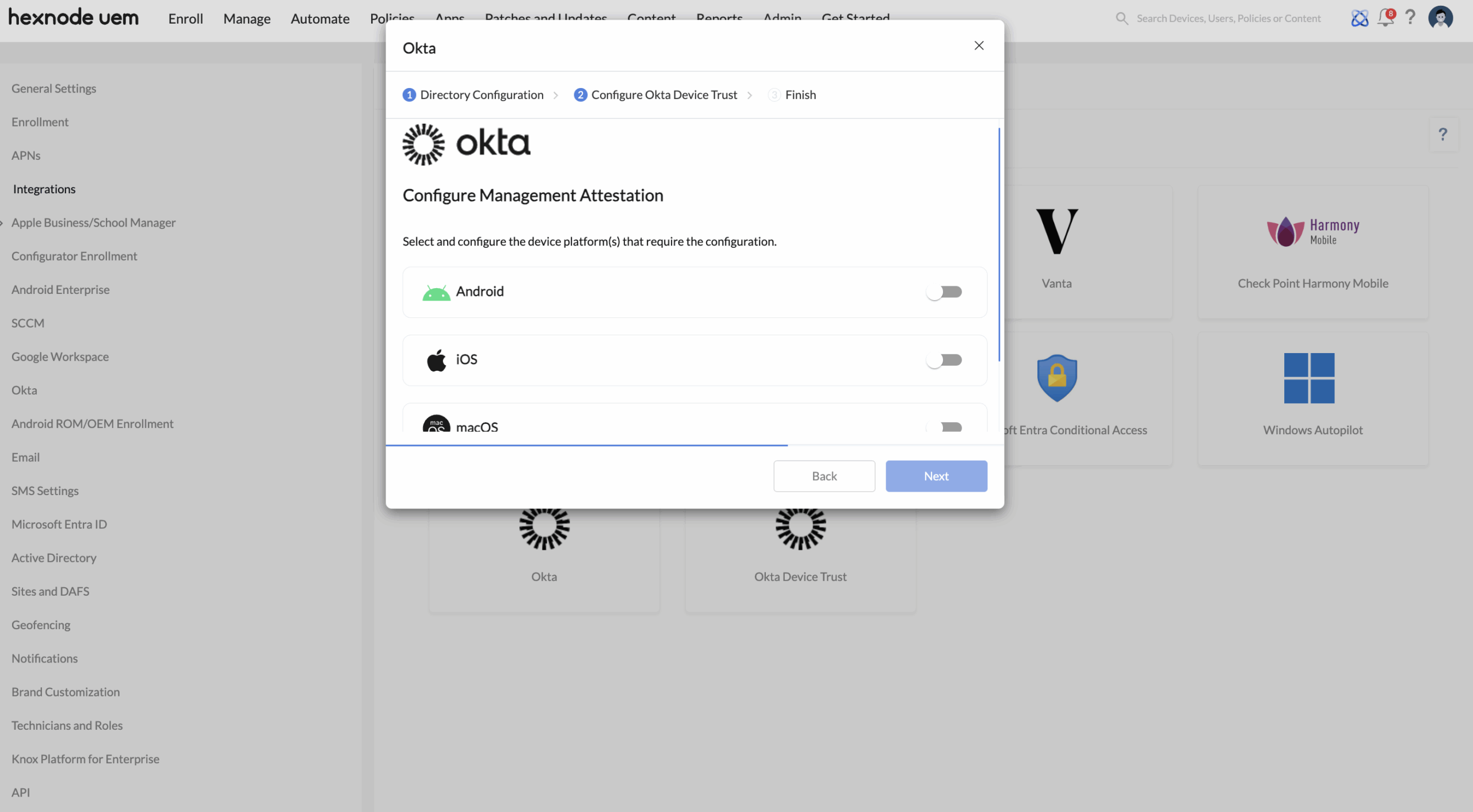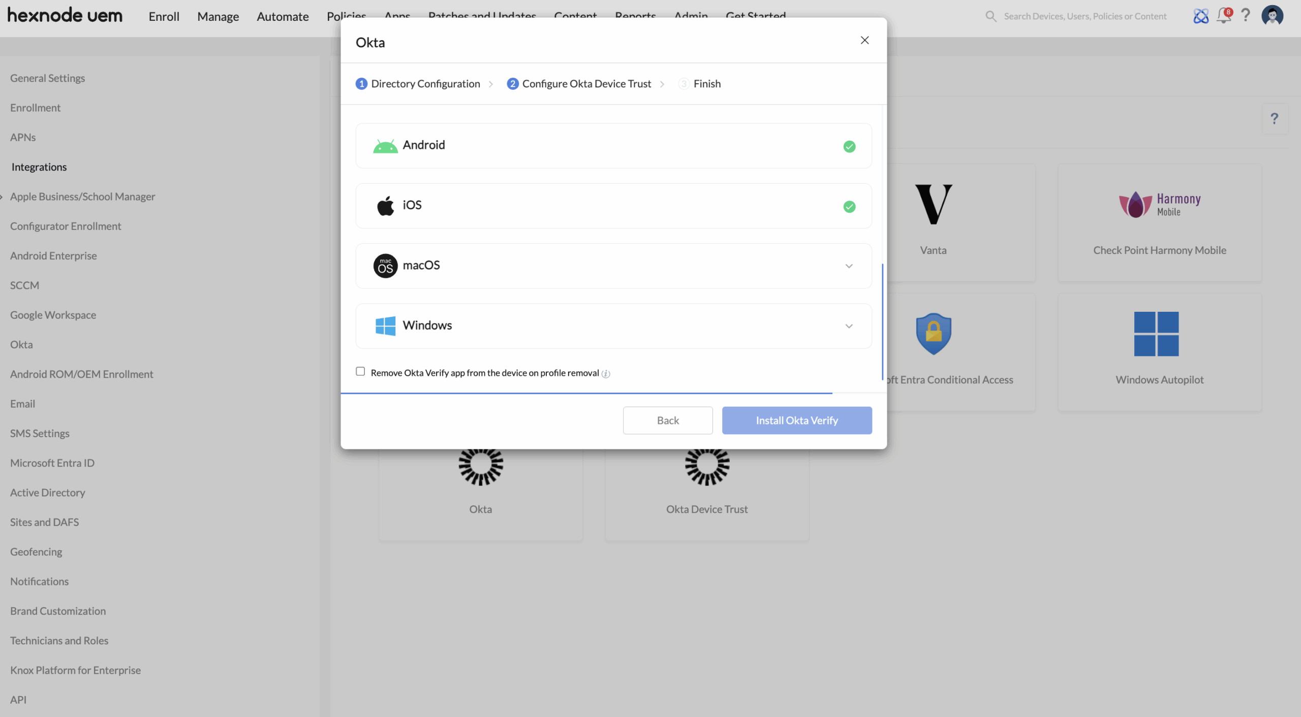 Once Okta is integrated, you can set up Okta Device Trust from within the Hexnode portal: