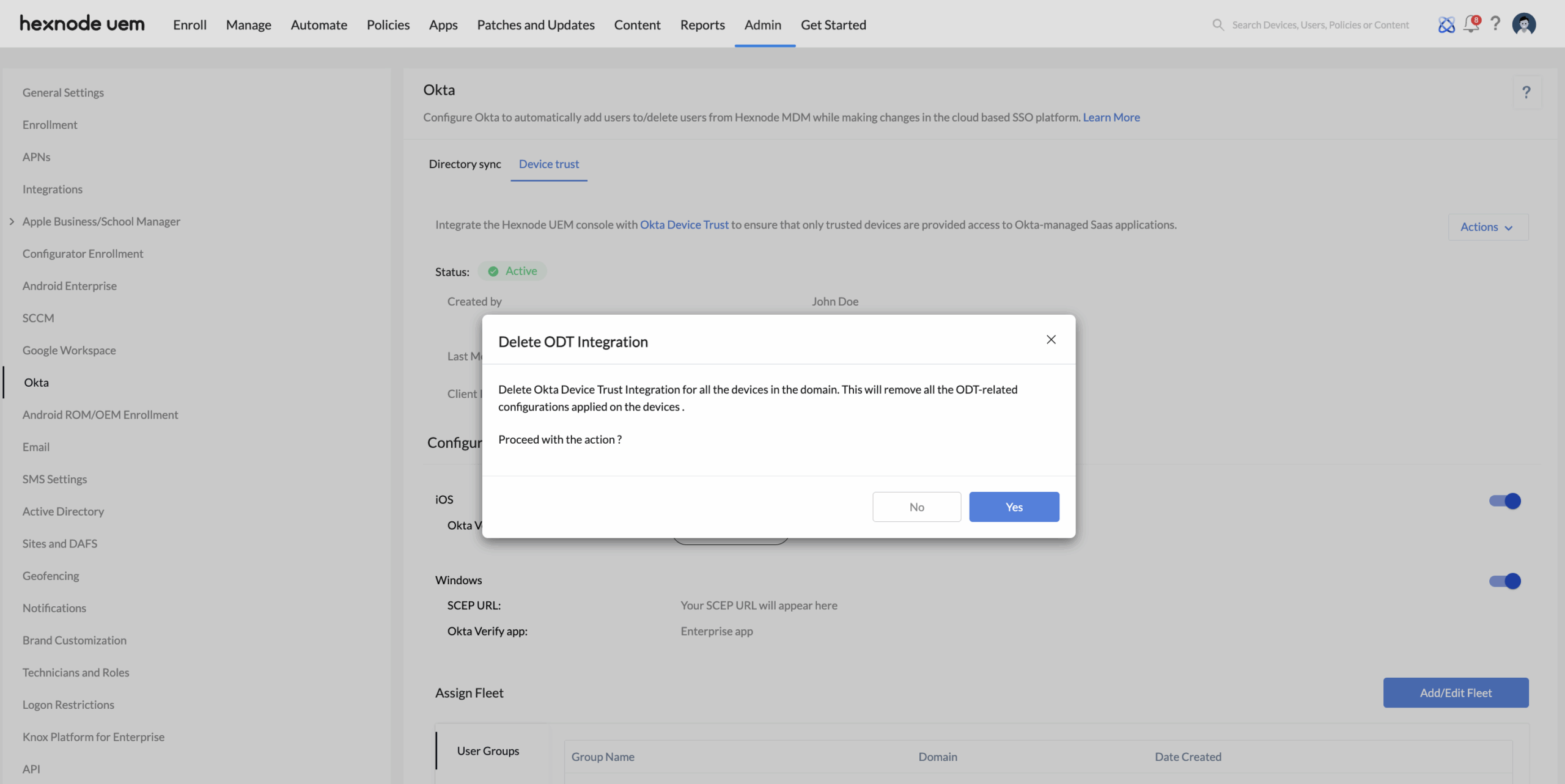 - Delete Okta Device Trust: Deleting Okta Device Trust will remove all related configurations from the devices managed in your Hexnode UEM console.