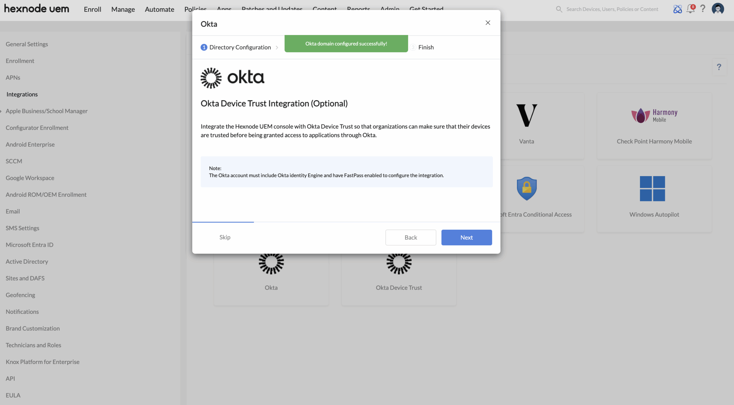 After successfully integrating, you can choose to click Next within the same window to configure Okta Device Trust (optional).