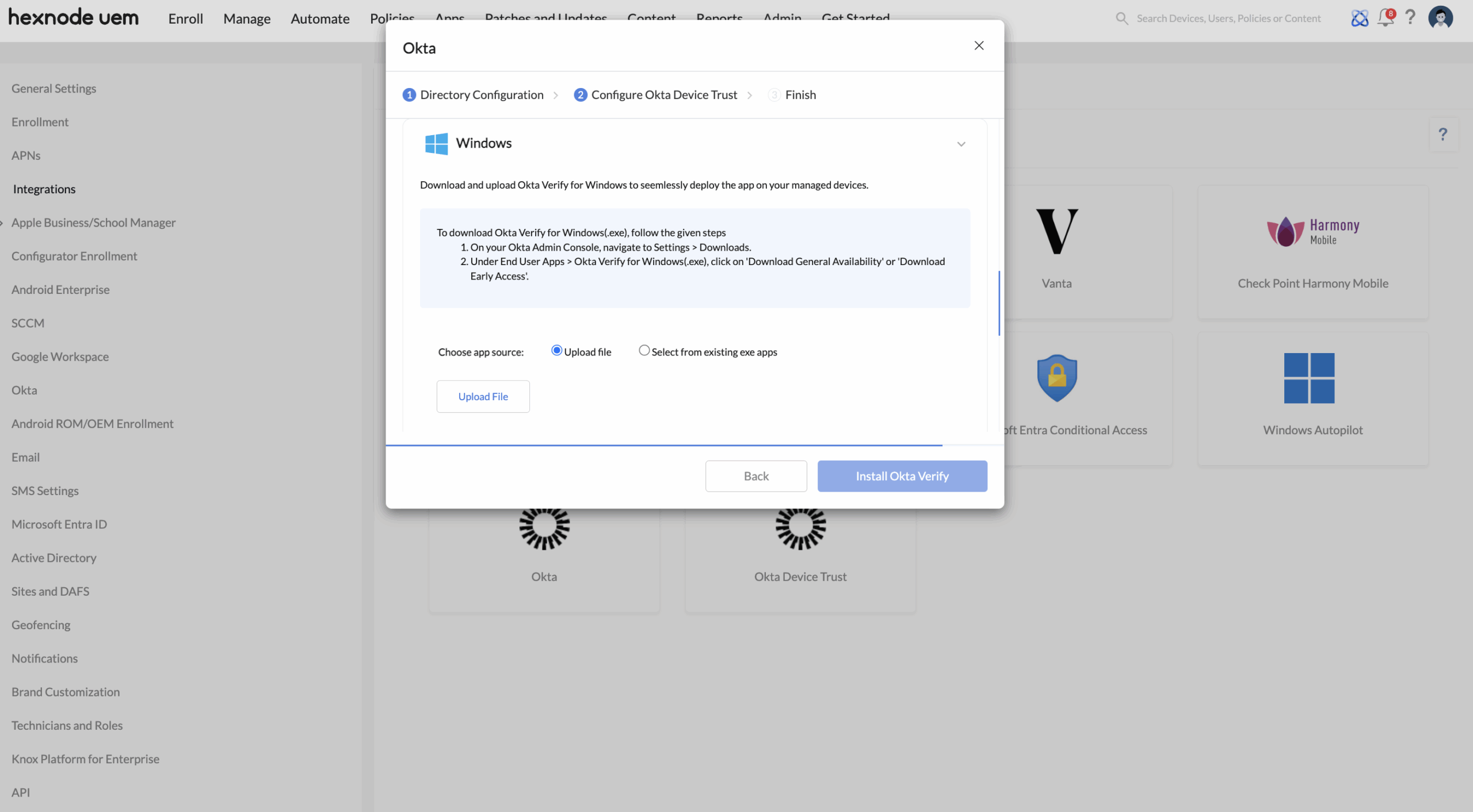 - Upload the downloaded EXE file to the Hexnode UEM console during the Set up Okta Device Trust in the Hexnode UEM portal step to proceed with the installation of Okta Verify.
