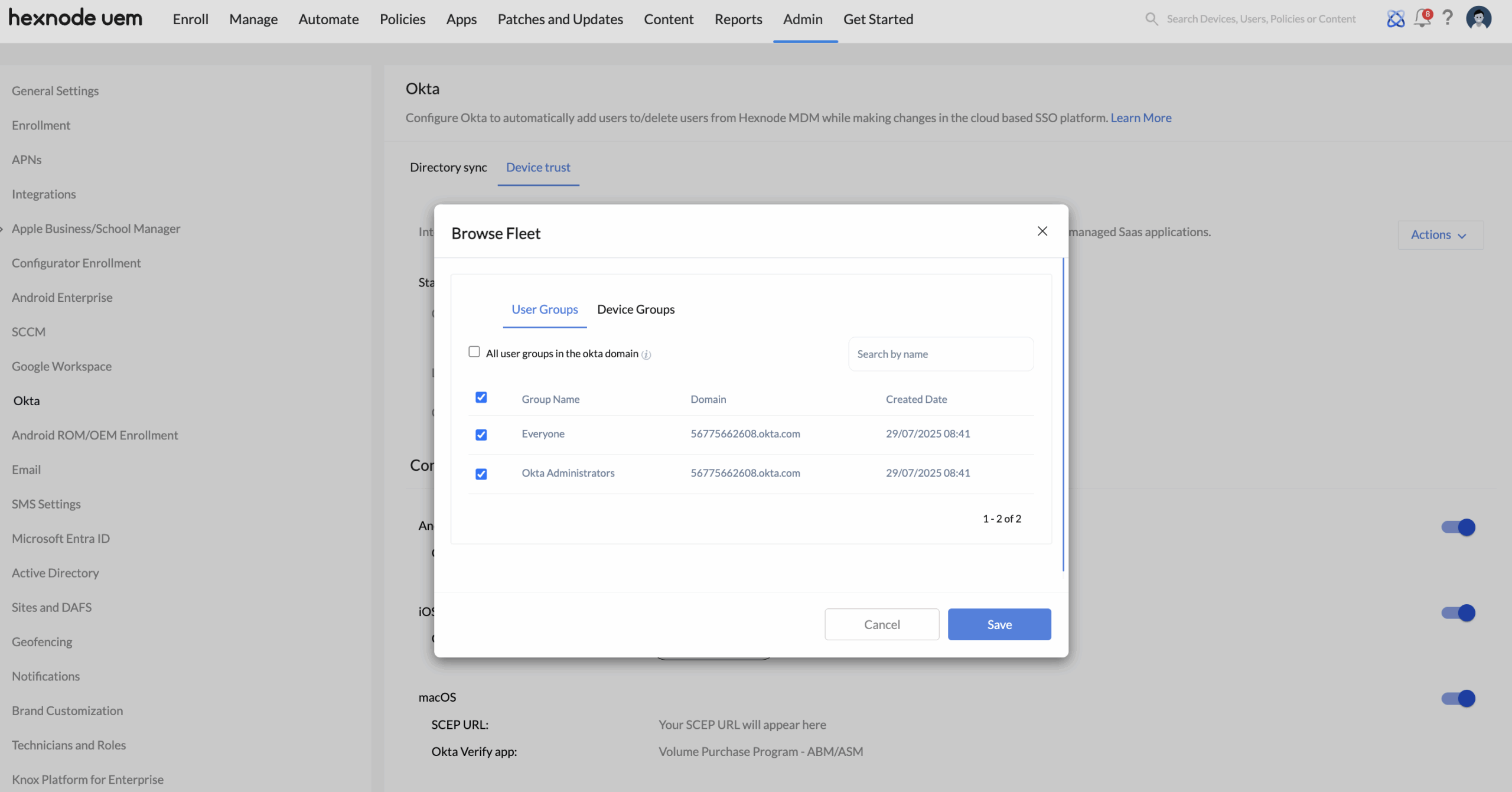 - Add or edit user/device groups: You can add or modify the user and device groups linked to your Okta Device Trust configuration from within the Hexnode UEM portal. To do this, click the Add/Edit Fleet option. This will open a window where you can: