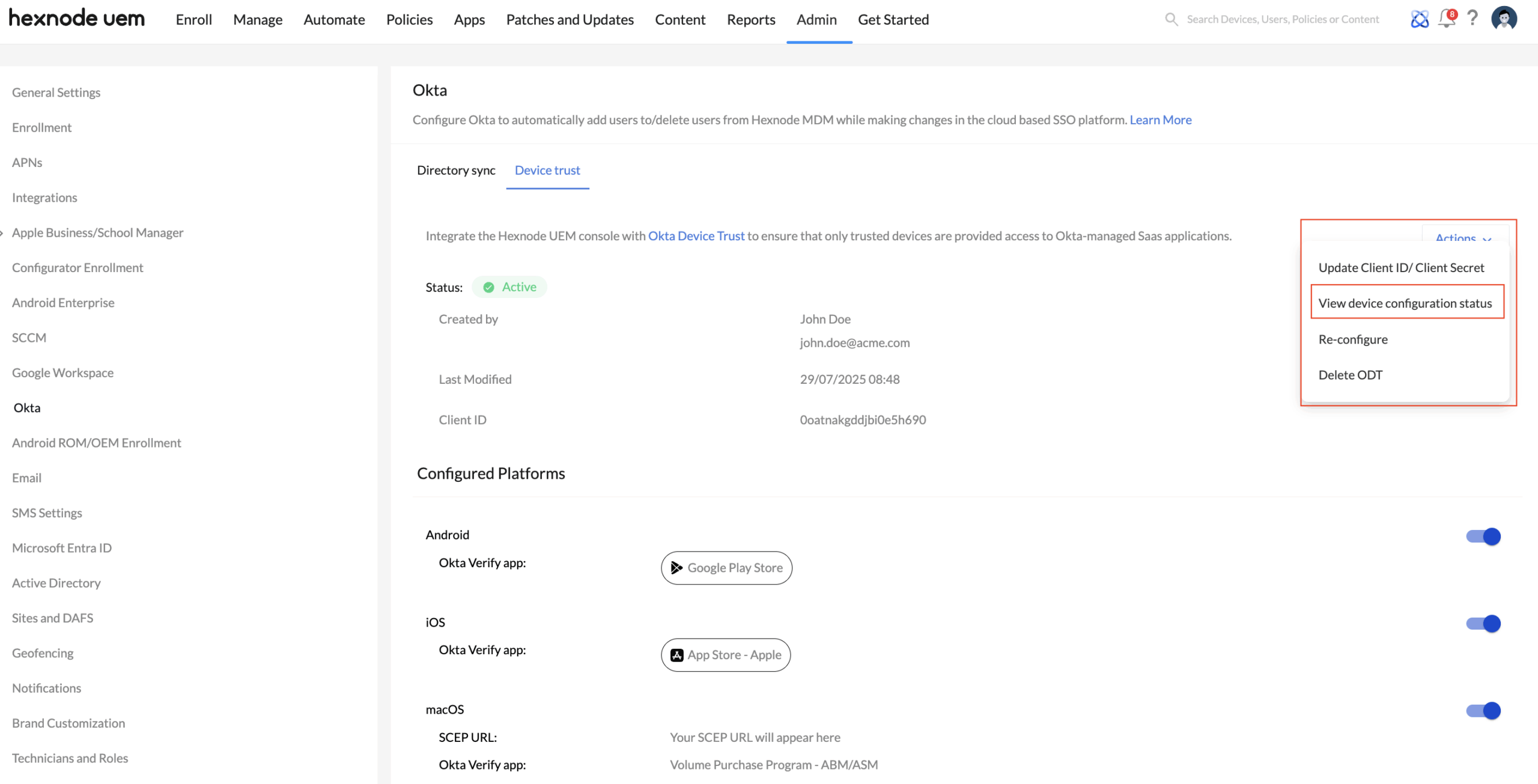 Go to Admin > Okta > Device Trust, then click on Actions, where you will be able to: